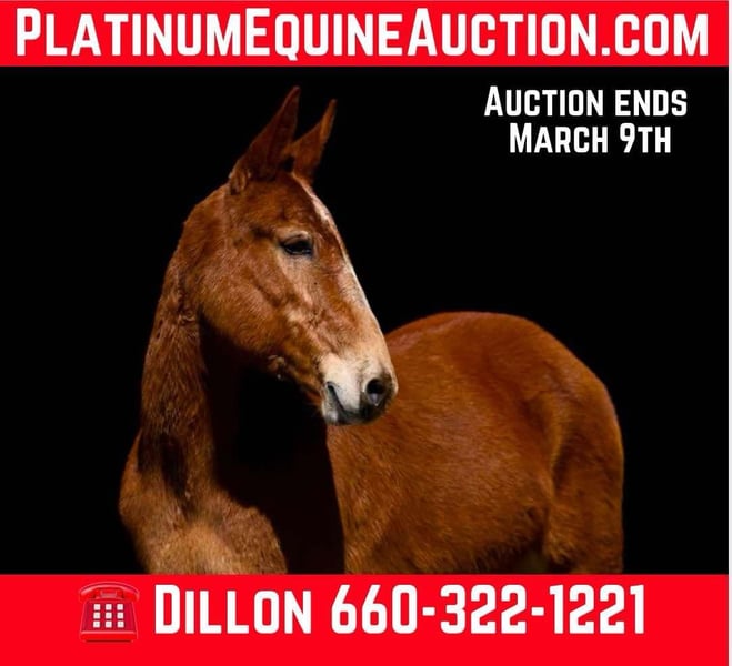 ONLINE AUCTION Place your bids at www.PlatinumEquineAuction.com Starting Bid $3500 Auction ends March 9th, 2025 Need a new saddle? Check out White Rock Saddles on our website or Facebook! Lilly is a 11 year old Molly mule. She stands 14.3 hands tall. Lilly has been a part of our program for the last 7 years. From trail riding, to overnight camping trips. She also worked for a living through out the year. By penning back cattle at the sale barn and moving pairs to summer pastures in the spring time. She has a nice smooth walk and trot with a rocking chair lope on her that makes her very comfortable to ride all day long . She does not shy or spook for on coming traffic or equipment. She will cross creeks, jump logs and go down any creek banks. Lilly will stand tied, load in a trailer, and will pick up all four feet. Lilly is also broke to drive single and double. She will be a 100% sound and gentle every time you catch her. She is ready for anything you throw at her. For more questions please call Sunset S Equine Dillon 660-322-1221 Located in Carrollton, MO. ONLINE AUCTION Place your bids at www.PlatinumEquineAuction.com Starting Bid $3500 Auction ends March 9th, 2025 Need a new saddle? Check out White Rock Saddles on our website or Facebook!