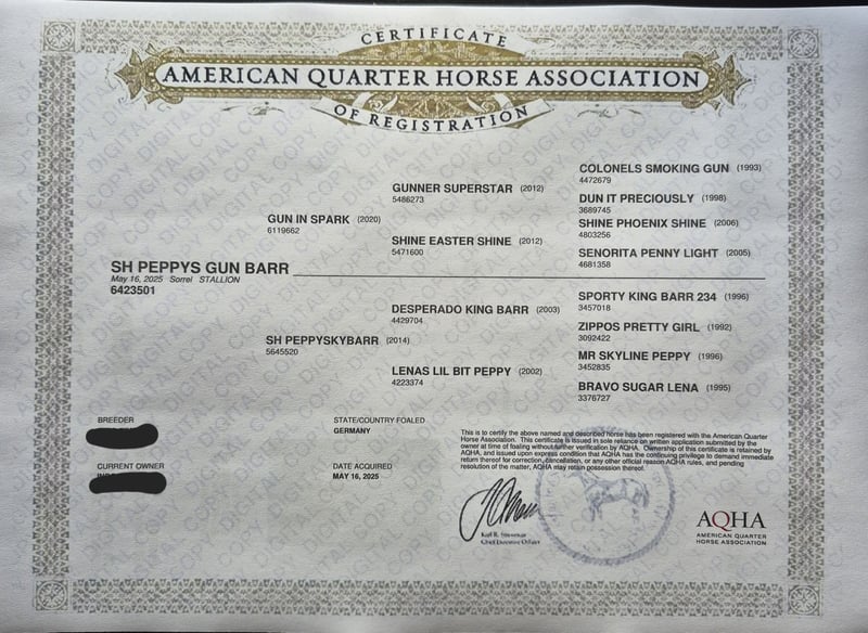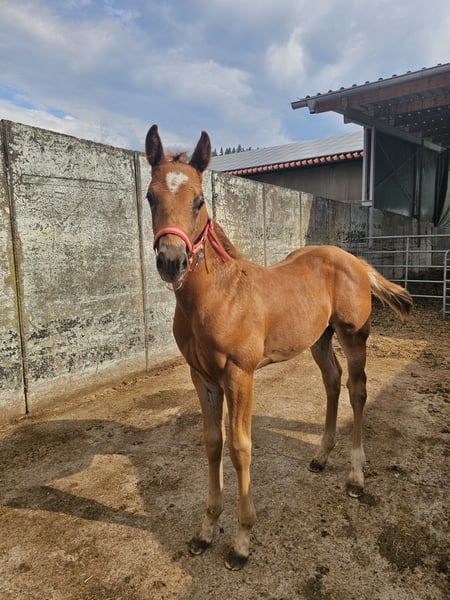 Pretty, very calm colt. Super pedigree. Suitable for sport and of course also for ambitious leisure riders. Family horse. Learns the foal ABC until weaning. Estimated final height 150cm. Grows up healthy on our large Black Forest pastures, in a herd. - Stable foundation and strong bones - Good conformation - Good character - Easy to handle - 5 Panel N/N through the parents - CoR AQHA and DQHA passport are applied for **Entering the yard and the pastures of the operation for viewings as well as riding of sale horses is always at your own risk! Exclusion of any warranty! For trial rides of our sale horses, we charge €50. This amount will be deducted from the purchase price of a horse.**