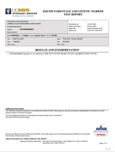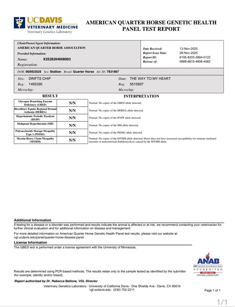 Fils de Drifts Chip, un cheval noir pur-sang (homozygote agouti et homozygote noir), très sociable. Drifts Chip a passé toute sa vie à la Ranch 6666 au Texas. Surnommé "Midnight", Drifts To the Future ne lui ressemble en rien en termes de tempérament. Il possède des os et des sabots solides et est absolument facile à manipuler ! Il peut être inscrit dans diverses registries de fondation. Test génétique 6 panels N/N. Un transport peut être organisé.