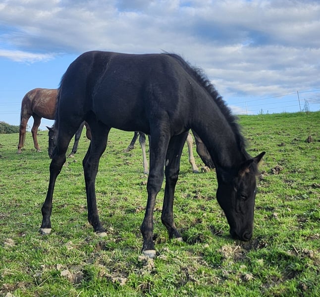 Umgänglicher rein-schwarzer (homozygot agouti & homoyzygot schwarz) DRIFTS CHIP-Sohn. Drifts Chip stand sein ganzes Leben auf der 6666 Ranch in Texas. Drifts To the Future genannt "Midnight" wird seinem Vater in nichts nachstehen. Er hat stabile Knochen und Hufe und ist absolut umgänglich! Kann bei diversen Foundation Registries angemeldet werden. 6 panel N/N Transport kann organisiert werden