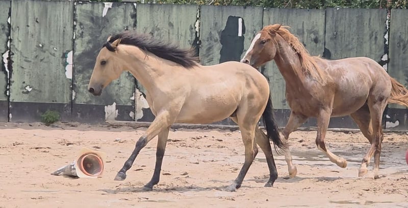 **HES Holywood Hancock** Buckskin Roan kleurig Amerikaans Quarter Horse veulen *09.05. 2024 ( kleurtest loopt in Davis) geschatte hoogte:** 153 cm Western Ranch Paardenklassen / Reining / Fokkerij We bieden een veelbelovend Amerikaans Quarter Horse hengstveulen te koop aan. Deze jonge Buckskin-ROAN hengst, geboren op 09.05.2024, maakt indruk met zijn onvergelijkbare charisma, bouw en talent voor beweging. Hij is al ongelooflijk gespierd, wat waarschijnlijk van zijn moeder komt. Hij schittert ook met grote sterke gewrichten en een stabiel en correct fundament, met een schofthoogte van 153 cm en uitstekende geschiktheid voor westernrijden. Hij maakt ook indruk met zijn opvallende kleur, zijn vriendelijke karakter en zijn bereidheid om te leren. Deze hengst heeft het potentieel om een uitstekende partner te worden in het westernrijden en heeft de beste kenmerken van zijn ras. hij is gechipt - COR is aangevraagd en zal het DQHA paardenpaspoort ontvangen Hij kan ook worden betaald in overeenkomstige jonge paardenprogramma's. Als je geïnteresseerd bent of nog vragen hebt, horen we graag van je!