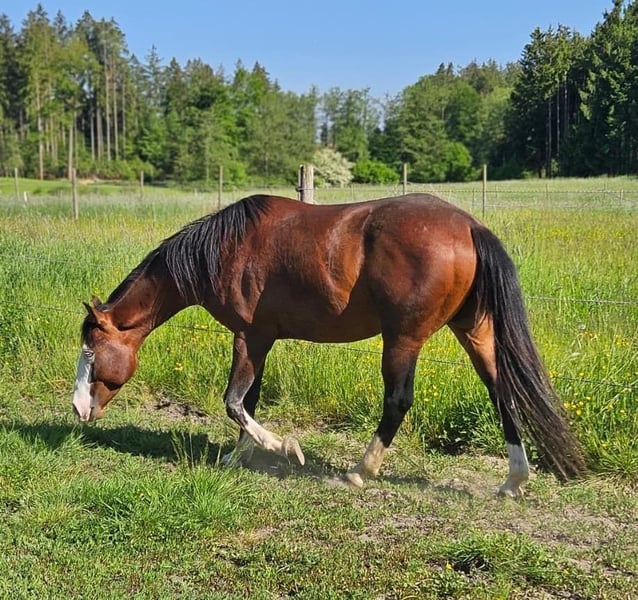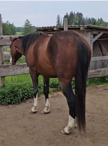 Flashy Gotta Gun - bien construido, querido semental Quarter Horse, nacido en 2022 con una altura final de aproximadamente 155 cm, con una mentalidad excepcional. No solo impresiona por su carácter, sino también por la maravillosa sensación de monta que ofrece. Flashy siempre se esfuerza por hacer las cosas bien, es muy amable, tranquilo y bien educado. El semental creció en las mejores condiciones con la mejor alimentación y minerales. Es 6-Panel n/n. Se encuentra en un establo abierto en un grupo de sementales/guasos y hasta ahora no ha mostrado comportamiento de semental. Tiene una estructura compacta y musculosa con una excelente línea superior. Flashy realiza los tres aires básicos bajo la silla. Conoce el trabajo en mano y se comporta muy bien como caballo de compañía en el campo. El año pasado cubrió dos veces, y hay un potro disponible para ver en el lugar. El semental tiene un excelente linaje de reining antiguo. Su padre, Black Gotta Gun, fue mostrado con éxito (LTE: 11,000 $). La madre de Flashy es Raye Peponita. En la evaluación veterinaria, las radiografías mostraron un ligero cambio, por lo que se ofrece por debajo de su valor. Nunca ha mostrado cojeras ni nada por el estilo y puede ser utilizado como caballo de ocio.