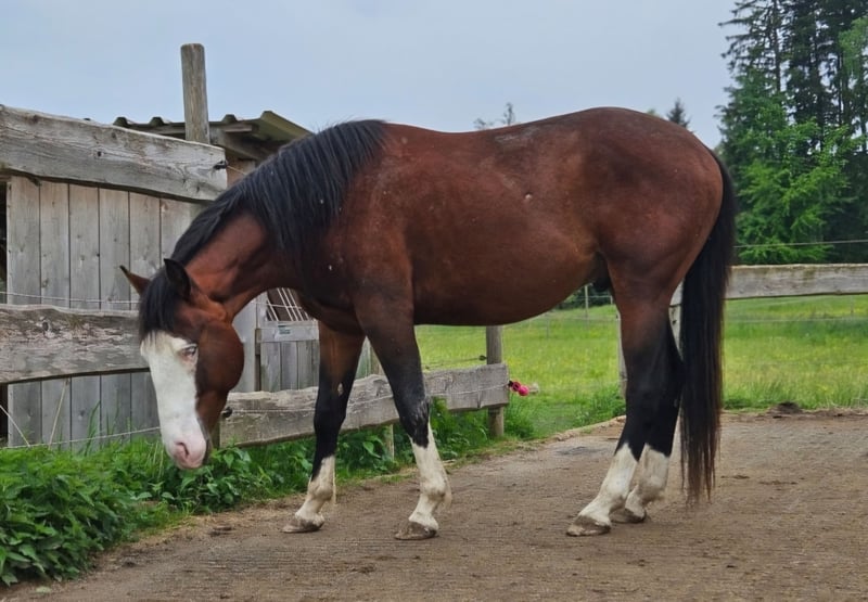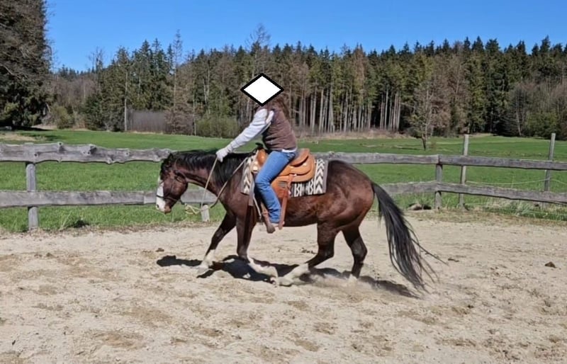 Flashy Gotta Gun - gut gebauter, lieber Quarter Horse Hengst, 2022 geboren mit einem Endmaß von ca. 155 cm, mit super Mind. Er überzeugt nicht nur durch seinen Charakter, sondern auch durch das tolle Reitgefühl, was er einem bietet. Flashy ist immer bemüht alles richtigzumachen, sehr lieb, brav und gut erzogen. Der Hengst wuchs unter besten Bedingungen mit allerbestem Futter und Mineralien auf. Ist 6-Panel n/n. Steht im Offenstall in einer Hengst/Wallach Herde und ist bisher nicht hengstig. Er hat ein kompaktes, kräftiges Gebäude mit toller Oberlinie. Flashy geht unterm Sattel die drei Grundgangarten. Kennt Bodenarbeit und geht sehr brav als Handpferd mit ins Gelände. Letztes Jahr hat er 2-mal gedeckt, 1 Fohlen ist vor Ort zu besichtigen. Der Hengst hat eine sehr gute, alte Reining Abstammung. Sein Vater, Black Gotta Gun, wurde erfolgreich geshowt (LTE: 11.000$). Flashys Mutter ist Raye Peponita gezogen. Bei der AKU zeigten die Röntgenbilder eine leichte Veränderung, weswegen er unter Wert abgegeben wird. Er zeigte nie Lahmheiten etc. und kann als Freizeitpferd genutzt werden.