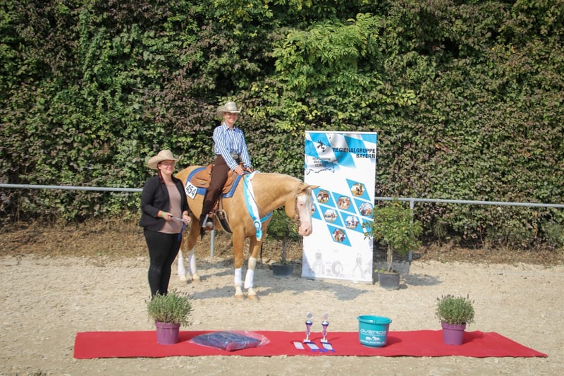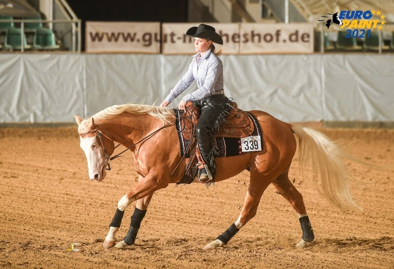 Giovane stallone molto tipografico con una base stabile e corretta, atletico e forte nei movimenti. Presenta andature piatte ed elastiche e colpisce per il suo carisma. Geni del colore: splash 1 ,splash 2 5 canali negativi: PSSM1 n/n, Herda n/n, HYPP n/n, MH n/n, GBED n/gbed, OLWS n/n Costo dell'allevamento: 550€ più spese di gestione È molto maneggevole e facile da addestrare, cosa che trasmette sempre alla sua prole. Inoltre, il suo solido pedigree da allevamento/ranch fa di lui e della sua progenie un ottimo partner per il tempo libero e un cavallo da esposizione da ranch. Successi: -Test di performance dello stallone PHCG -Campione Bavarese di Reining verde -Campione bavarese di equitazione da ranch -Campione Bavarese Ranch Rail Pleasure -Medaglia di bronzo Euro Paint Ranch Rail Pleasure -Top 10 Equitazione da Ranch Euro Paint Prole di successo: -2023 Campione Europeo Reserve 2Yr Old Geldings -2023 Campione di maturità PHCG Stallone/Gelding di 2 anni -2023 Campione PHCG Foal Show con premio 1A con 8,1 -2022 5° Stallone svezzatore PHCG Futurity - 2021 Puledro premio DQHA 1A con 81,78%. -2021 Puledro premio PHCG 1b con 7,6 -2021 Puledro premio DQHA 1b con il 77,84%. -2021 Puledro premio PHCG 1A con 8,1