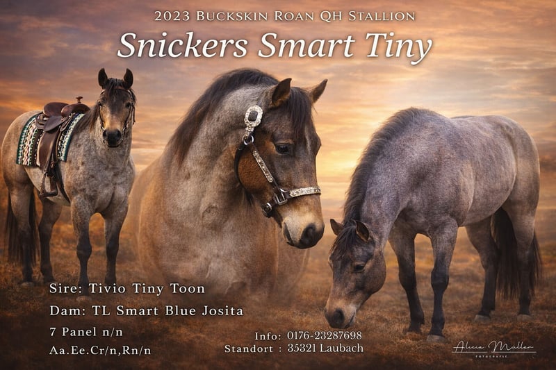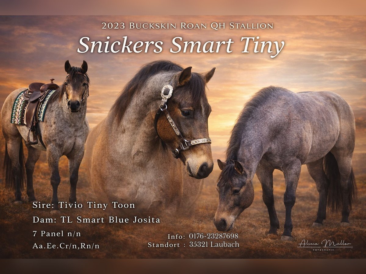 Unser Pachthengst Snickers Smart Tiny deckt auch ihre Stute im Natursprung an der Hand. Er ist im Mai 2023 geboren und wird aktuell unter dem Sattel ausgebildet. Dort zeigt er sich stehts artig, entspannt und motiviert, ein Hengst mit einem Charakter aus Gold. Erste Stute tragend untersucht. Er ist 7 Panel n/n. Aa, Ee, Cr/n, Rn/n Decktaxe: Quarter Horse, 500 Euro + 80 Euro Buchungsgebühr Andere, ZSSE: 300 Euro + 80 Euro Buchungsgebühr