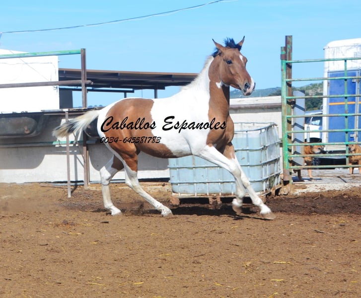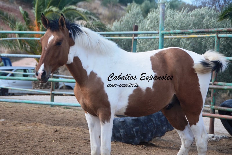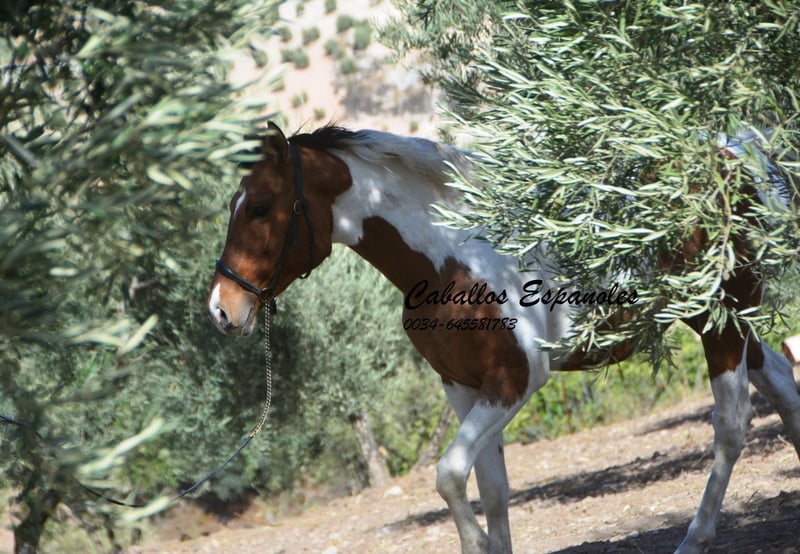 Ce charmant étalon espagnol pie bai andalou possède une conformation solide et une très belle robe pie. Le jeune cheval se trouve avec ses compagnons dans le paddock et aime jouer avec eux. Au début, il peut être un peu timide, mais il se détend rapidement et a apprécié qu’on lui caresse la crinière. C’est un jeune étalon idéal pour une reproduction autonome. Si vous êtes intéressé, nous serions ravis de recevoir votre contact pour discuter des détails ou organiser une visite. Le cheval est vendu pour le compte du propriétaire. Il peut rester en pension chez nous pour son dressage. Une échographie peut être organisée rapidement. Transport international disponible.