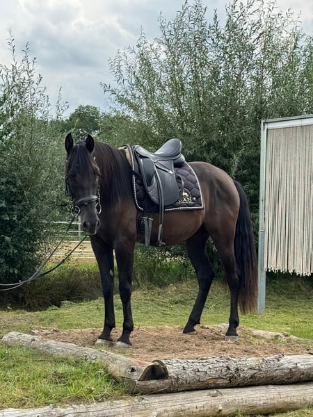 This stunning, jet-black Andalusian gelding was born in 2021 and currently measures approximately 16.0 hh. He impresses with his correct conformation, elegant appearance, and, most notably, his exceptionally sweet temperament. He is very affectionate, friendly, playful, and open-minded towards people. Despite his young age, he is already remarkably calm in handling and always well-behaved—whether at the vet or the farrier. He has been regularly dewormed and vaccinated, holds a passport, and is familiar with various types of stabling, including box stabling with turnout and herd life. He is still developing age-appropriately but has already been lightly and patiently backed through playful groundwork. Under saddle, he is eager to learn, attentive, and versatile. He has gained initial experience in the field and on the road, which he handled confidently. Additionally, groundwork and classical dressage exercises, such as the compliment, have been introduced; he already performs this well. The rein-back is currently being developed, and he has been gently introduced to piaffe. This young gelding has all the qualities to develop into a reliable partner. He is especially suitable for riders who enjoy patiently and sensitively furthering a young horse's education and growing together.