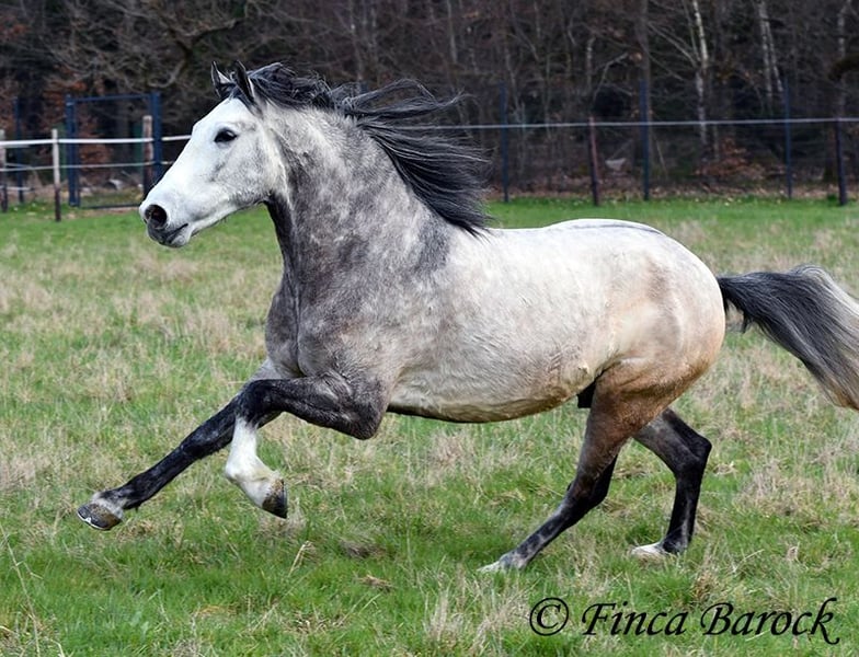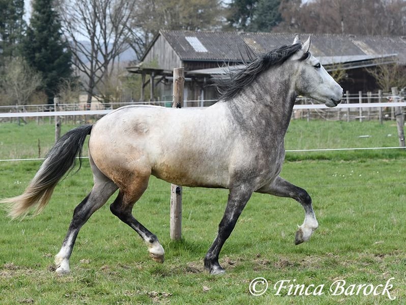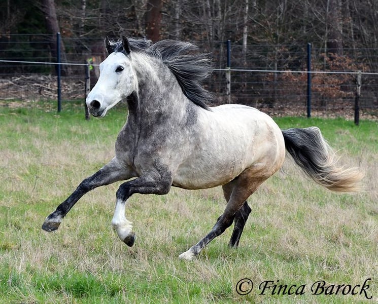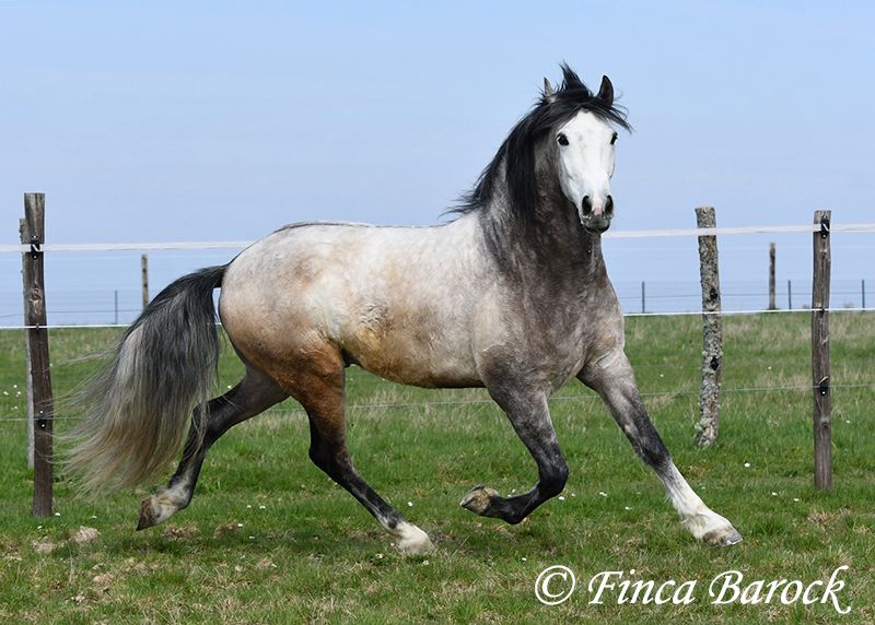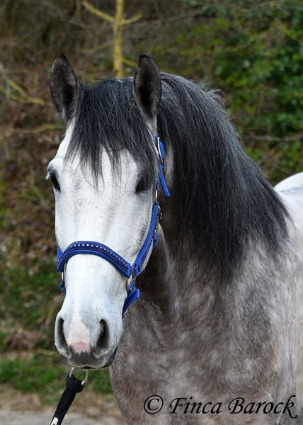 Breed: Andalusian Name: Bambino Gender: Gelding Height: 1.60 m Date of Birth: December 12, 2020 Color: Grey (Dapple Grey) Price: €12,500 Sire: Unknown Dam: Unknown Bambino is an absolute sweetheart and quickly wins everyone over with his friendly nature. He has been ridden in the dressage arena and is more experienced in trail riding than in work within the ring. Trail riding is his absolute specialty. He is comfortable going alone or in a group, often leading confidently but remaining relaxed at the back as well. In the arena, he is currently learning the basics. He responds well and wants to please his rider. He has a lovely uphill canter and comfortable movements. Overall, Bambino is more the type to motivate rather than to be difficult. He is by no means lazy! The clearer the rider’s aids, the easier he is to move forward. Bambino is playful and enjoys everything that can be used for fun—whether it’s a blanket in front of the box or grooming tools within reach, he finds everything interesting to play with. He remains polite with people at all times. He is of sturdy build and provides good coverage for the rider. With him, you get a playful boy with comfortable movements and a friendly character who is eager to grow further with his rider. Includes clinical examination and X-rays. Contact: Finca Barock, Tel. 0173-696 31 81, 56291 Wiebelsheim