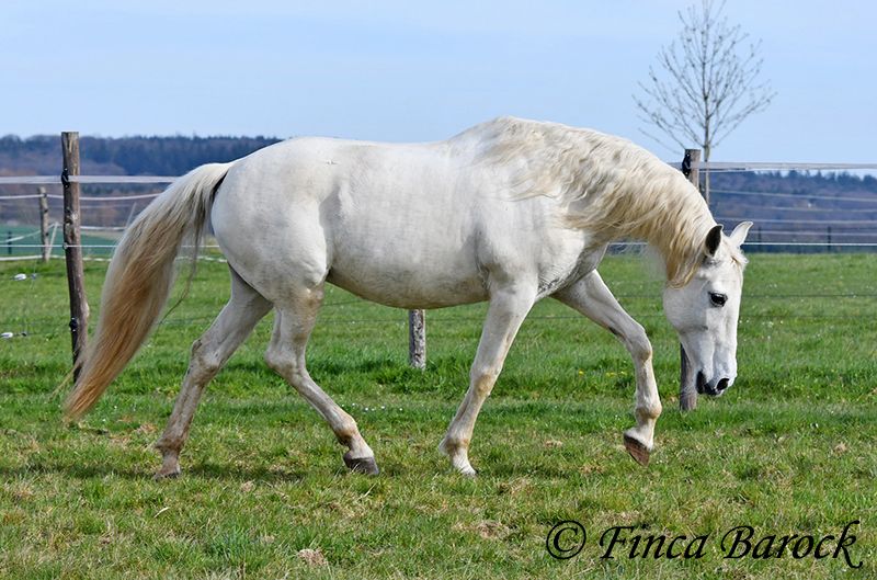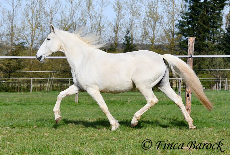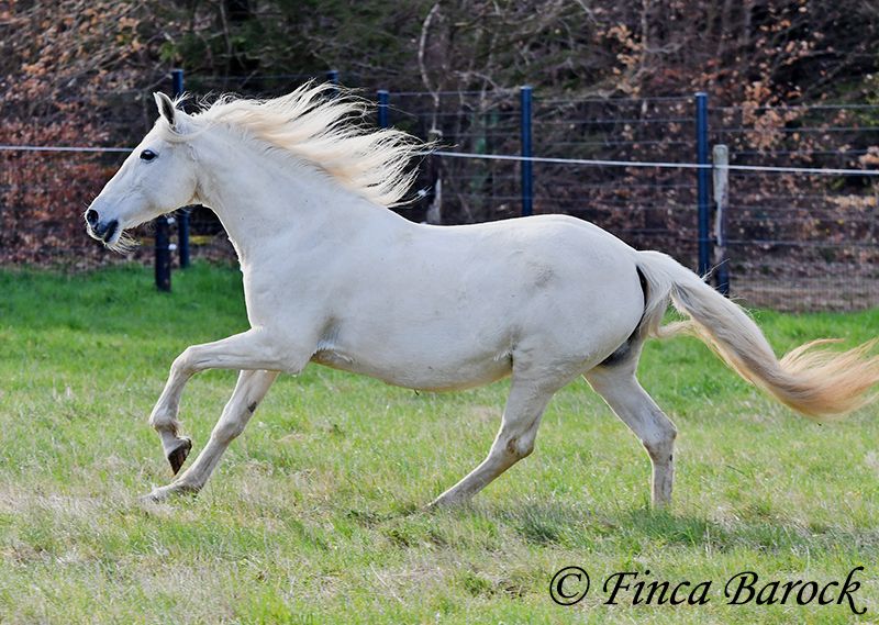 Rasse: Andalusier Name: Amena Geschlecht: Stute Stockmaß: 160 cm Alter: 20.03.2007 Farbe: Schimmel Preis: 2900 € Vater: o. P. Mutter: o. P. Amena, ist eine kompakte Lady und wirkt direkt wie ein Einhorn aus der Fabelwelt. Sie ist seit 9 Jahre in Deutschland und immer in einer Hand. Sie stand im Offenstall in Herdenhaltung. Amena ist überwiegend im Gelände geritten worden. Hier kennt Sie es alleine als auch in der Gruppe herauszugehen. Sie kennt natürlich auch Straßenverkehr, Fahrradfahrer etc. In den letzten Monaten wurde Sie aus Zeit und Gesundheitsgründen der Besitzerin nicht mehr gearbeitet – das ist auch der Verkaufsgrund. So sucht eine bezaubernde Maus ein passendes Zuhause. Bei uns wird Sie Stück für Stück wieder antrainiert. Es braucht aber noch Aufbautraining bis Amena wieder ein volles Reitpferd wird. Amena hat unglaublich sitzbequeme Bewegungen welche zu langen Ausritten einladen. Sie macht gut mit und ihre Kondition wird bei jeder Einheit besser. Amena sucht einen Reiter der ihr nicht zu viel Druck im Maul macht. Sie bevorzugt eher etwas längere Zügel und ist diese von Ihren Ausritten gewöhnt. Sie gehört aber nicht zum alten Eisen und hat ein angenehmes Temperament. Sie ist nicht überdreht, aber auch keine Schlaftablette. Amena ist sehr gut erzogen, steht still am Putzplatz, kennt Hunde, Katzen und Kinder. Mit ihr bekommt man ein erfahrendes Geländepferd mit freundlichem Charakter. Sie ist deutsches Gras seit langen gewöhnt und Barhufer. Kontakt: Finca Barock, Tel. 0173-696 31 81, 56291 Wiebelsheim