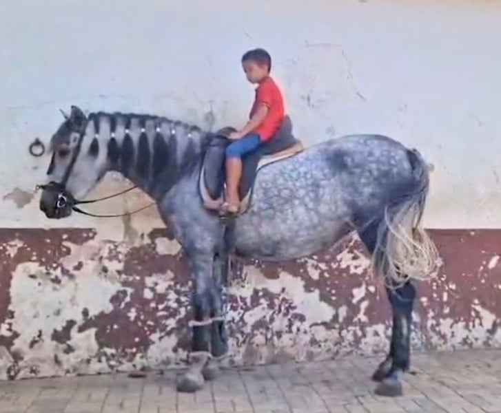 Piękna, typowa, barokowa klacz hiszpańska o dużym, eleganckim karku, solidnej budowie i wyrazistym wyrazie twarzy. Może nie jest jeszcze gwiazdą w konkursach, ale zachwyca łagodnym, bardzo przyjaznym usposobieniem, równowagą, chęcią do nauki i dobrym charakterem nerwowym. Solidnie wytrenowana około 6 miesięcy temu w stylu klasycznym na ogłowiu, dobrze radzi sobie w terenie i chętnie podąża samodzielnie. Nawet podczas pracy z bydłem wykazuje odwagę i nawet sprawia jej przyjemność „popychanie byka”. Uważamy, że ta urokliwa klacz będzie idealna dla ambitnych jeźdźców rekreacyjnych lub fanów Working Equitation, a także jako koń dla rodziny, ponieważ jest bardzo cierpliwa wobec dzieci. Dobrze sprawdzi się także jako koń dla młodzieży z doświadczeniem jeździeckim. Klacz ta pochodzi z linii PRE, co widać, choć nie posiada oficjalnych dokumentów z ANCCE, ponieważ nigdy nie złożyła wniosku o papiery; w związku z tym otrzymuje paszport, co wpływa na cenę. Na pierwszy rzut oka wydaje się zdrowa, choć na życzenie możemy przeprowadzić badanie kliniczne (AKU) przed zakupem. Transport na terenie Europy jest bezproblemowy i możliwy do zrealizowania w krótkim czasie. Cena, na przykład, do Niemiec wynosi około 1000-1300 € w zależności od miejsca docelowego. Więcej informacji i filmy tej klaczy chętnie udostępniamy przez WhatsApp w języku niemieckim, angielskim lub hiszpańskim.