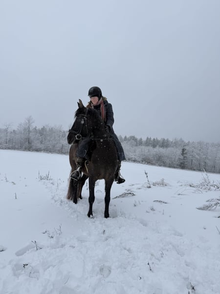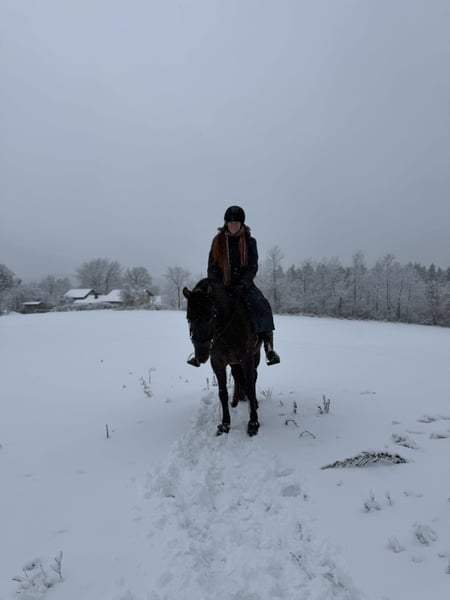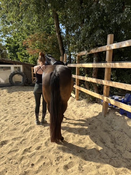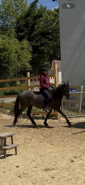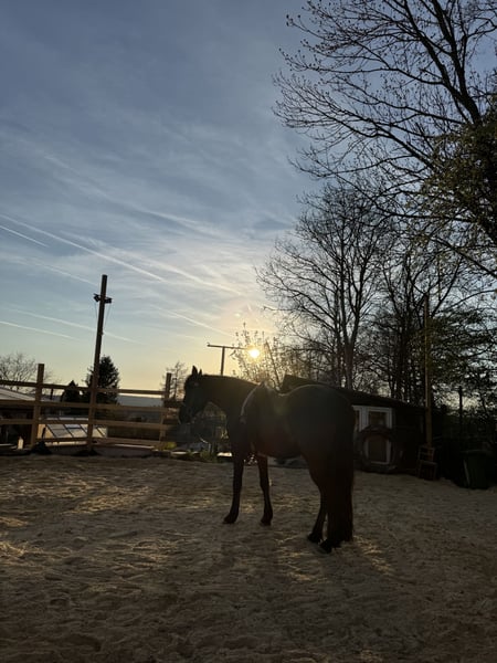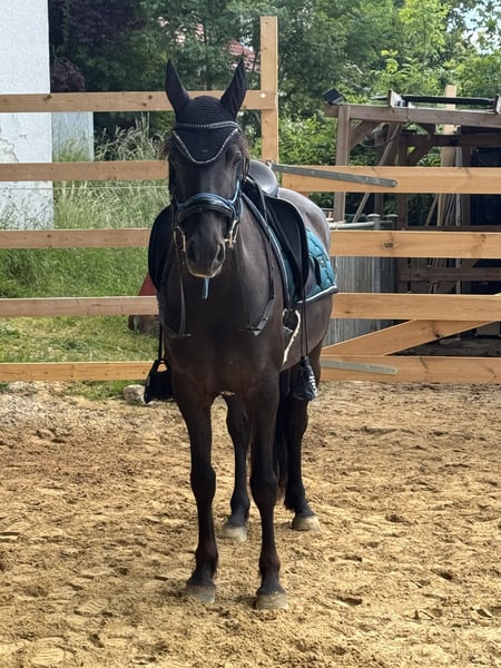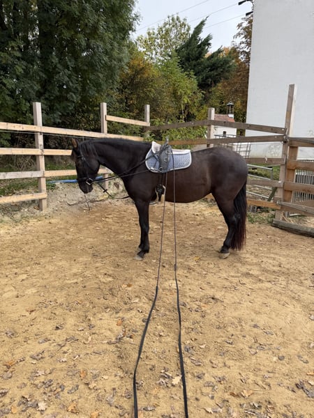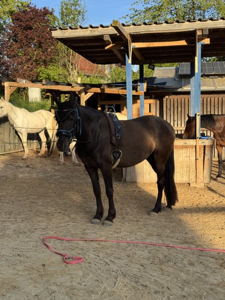 Da wir aus privaten Gründen unsere Pferdehaltung aufgeben müssen sind zwei Pferde zu Verkauf. Das hier ist Freya. Eine bald 5-jährige Spanier Mix Stute. Sie ist ca. 158 cm groß. Freya wurde im vergangenen Jahr schonend angeritten und zeigt sich sehr gut unterm Sattel. Ihre drei Grundgangarten sind alle so als würde man auf einer Wolke schweben. Sie ist super bequem und angenehm zu sitzen und hat schon einen außergewöhnlich gesetzten Galopp für ihren Ausbildungsstand. Freya ist ein sehr feines und gelehriges vielseitig gearbeitetes Pferd. Wir machen viel Bodenarbeit, Freiarbeit, Handarbeit, Doppellonge usw. Sie kann vom Boden und unterm Sattel die meisten Seitengänge. Freya ist ein sehr aufgeschlossenes, mutiges und neugieriges Pferd. Sie ist absolut menschenbezogen und verschmust. Sie kann auch schön einparken und spanischen Schritt. Im Gelände lässt sie sich super in allen drei Grundgangarten reiten. Sie geht auch brav und ruhig durchs Unterholz. Freya läuft als Handpferd und man kann sie auch schön mit Handpferd reiten. Auch im Galopp und quer durch den Wald macht sie das sehr unkompliziert. Da ich zu viele Pferde zu bewegen habe, gehe ich nie alleine mit einem Pferd raus. Deswegen wurde Freya noch nicht alleine ausgeritten. Alleine spazieren kennt sie aber und das alleine ausreiten klappt bestimmt auch, wenn sie sich gut mit dem neuen Besitzer zusammengewöhnt hat. Freya ist ein Pferd mit gutem Temperament. Sie ist ausgeglichen und ruhig, aber sehr leistungswillig. Wir suchen ein Zuhause für sie, in dem sie regelmäßig und abwechslungsreich bewegt wird. Freya ist robust und gesund. Die Zähne sind frisch gemacht und sie läuft barhuf oder mit Hufschuhen. Ihre Hufe haben sehr gute Qualität. Geimpft ist sie natürlich auch. Sie steht im Offenstall in einer gemischten Herde. Verladen klappt auch gut. Wir suchen ein Zuhause mit pferdegerechter Haltung und wertschätzenden Besitzern. Wetterbedingt kann auf unserem kleinen Reitplatz aktuell leider nicht geritten werden. Freya kann gerne in der Bodenarbeit und beim Ausreiten getestet werden. Wir nehmen uns ausführlich Zeit für dich zum Kennenlernen. Fürs Probereiten einer Person verlangen wir 40€. Das wird beim Kauf erstattet. Als Zubehör kann ein Westernsattel (Diamond / 1.000€) oder Springsattel (Prestige / 2.000€) erworben werden. Es kann auch der Rest der Ausrüstung für 300€ übernommen werden. Melde dich gerne, wenn du an diesem besonderen Pferd Interesse hast. Tel: 0152-24429139 Freya beim freien Einparken (scrolle gerne durch mein Profil für mehr Videos von Freya) https://www.instagram.com/reel/DN5pIOCDSdm/?igsh=bmxqd202NWllNWox