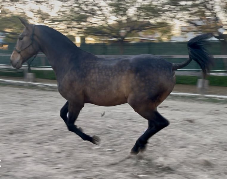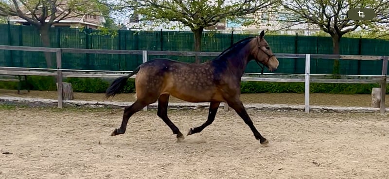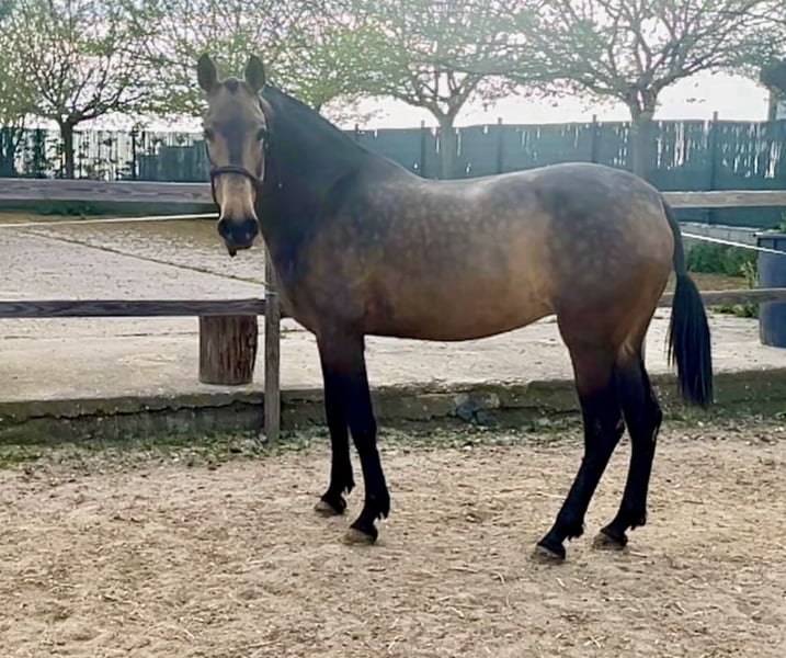 For sale: Purebred Spanish mare (PRE) with a bay coat carrying the cream gene. Approved as a broodmare and already producing excellent dilute foals. She is 8 years old, stands at 162 cm, and comes from the Divo PM bloodline of the prestigious Paco Martí stud. She is currently in foal to a beautiful 170 cm tall buckskin stallion. A great investment for breeding top-quality dilute foals. This is not a cheap mare, only serious enquiries by private message.
