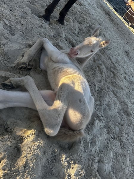 PRE-Juwel Solea – Dream Foal in Rare Color with Top Pedigree (Escalera/Salvatella Lines) Description: On April 23, 2026, the enchanting Solea was born. She is a purebred Spanish horse (PRE) foal, as beautiful as one could wish: correctly conformed, curious, and blessed with exceptional genetics. Pedigree & Potential: Solea holds full ANCCE registration. Her lineage combines the best of functionality and nobility: Sire: Embrujo Salvatella (Cremello) – renowned for rideability and athleticism. Dam: Jaleanta CPE (Buckskin with Sooty gene) – carrying valuable bloodlines from the famous Escalera line (via Indiano XLV) as well as functional lines from Francisco Caparros. With an expected height of approximately 16.0–16.1 hh, she will present an elegant appearance. We envision her as a willing and talented riding horse for working equitation, classical dressage, or fine free movement. Rearing: Solea is raised appropriately on large pastures within a herd, with plenty of family contact and love. She is well socialized and familiar with foal basics, ready to settle into her new home. We are already searching for the “perfect match” for this exceptional young lady – people who will appreciate her refined character and potential. Key Data: Born: April 23, 2026 Color: Likely Perlino (rare color genetics on both sides) Registration: Full ANCCE papers