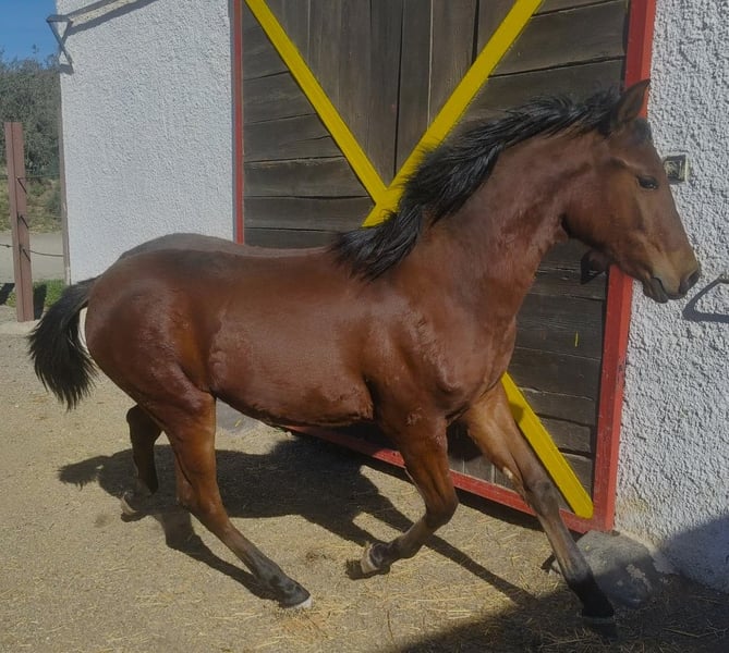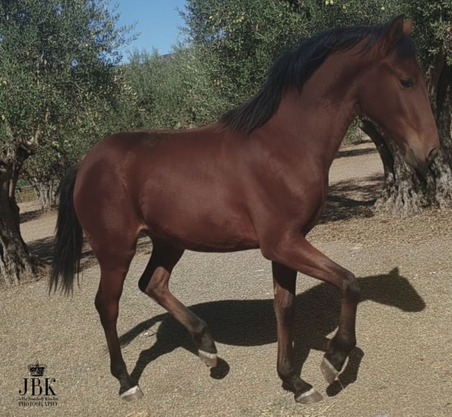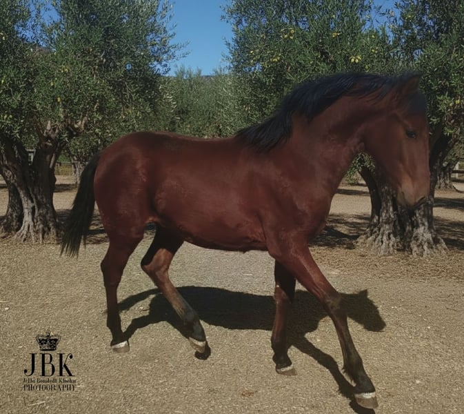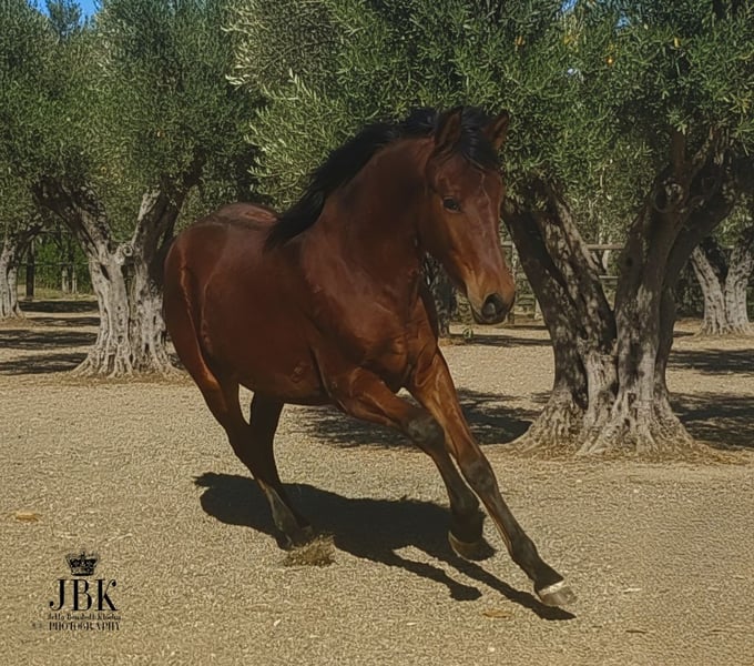 ☎️ WHATSAPP 🇪🇸 003463022494 Le jeune étalon andalou Saleroso est un poulain curieux et exceptionnel, qui montre de très beaux allures. Il est né le 29/04/2025. Son père est un étalon PRE Rapp, très bai, et sa mère une jument lusitano andalou. Il devrait atteindre une taille finale d’environ 1,64 m. En aucun cas plus petit. Saleroso est pucé et possède son passeport européen. Il apprend actuellement chez nous les bases du poulain, un peu de pansage, à se laisser prendre les pieds, ainsi que toutes ces petites choses qui lui seront utiles plus tard. Il se laisse déjà mener à la longe sur quelques pas et suit le cavalier avec confiance.