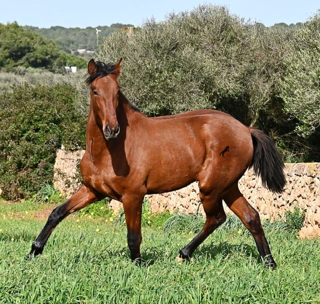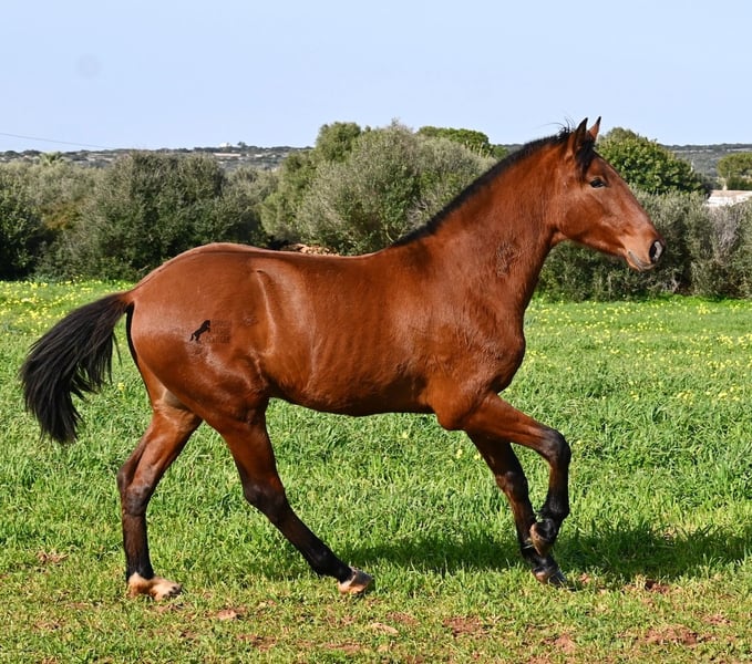 Este potro PRE nacido en verano de 2024 (Andaluz con certificación de raza de la ANCCE) ya llama la atención por su presencia. Actualmente vive las 24 horas en un paddock de resistencia y, gracias a los suelos duros de Menorca, tiene una excelente calidad de casco y está bien atado. Aunque vive en un entorno tan robusto, es increíblemente cariñoso y busca contacto amistoso en cuanto uno se acerca a la pradera. Su linaje hará latir más fuerte a los aficionados del caballo español. Por parte de padre, desciende de SENILLOSA, con ESCALERA en sus ancestros. Por parte de madre, es nieto de DARTURO III, de la cría RETAMALES, y su madre también tiene sangre de PLAZA DE ARMAS y CAMPO BAJO. Esta excelente selección de cría se refleja en él, ya que no solo es hermoso desde ya, con una cabeza típica de la raza y un exterior barroco, sino que también presenta un movimiento excelente, que demuestra con soltura a pesar de los terrenos pedregosos. Un caballo joven y feliz, a un precio justo para la calidad que ofrece. Su padre mide 1,70 m y él también será un caballo de gran tamaño. Actualmente se encuentra en Menorca. Videos y genealogía disponibles bajo petición. Con gusto puedo organizar una revisión de potros en el lugar, transporte o incluso su viaje si desea venir a verlo en persona. Para más detalles, consulte mi página o hable conmigo. ¡Saludos desde España!