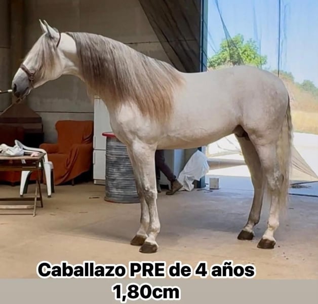Spanish White Horse, 180 cm (approximately 16.1 hh) at the withers. Guason VS Age: 4 years Purebred Spanish horse documentation available! Approved for breeding! Longeing under saddle performed by the renowned Spanish trainer Israel Vargas Silva. High School Dressage Date of Birth: 11/04/2021 Gender: Stallion Coggins Test: Negative Vaccinated annually Teeth regularly floated Viewable in Bari Name: GUASON VS Longeed and trained in haute école by Master Israel Vargas Silva Gaits: Walk, Trot, Canter, Spanish Walk, Piaffe, Passage