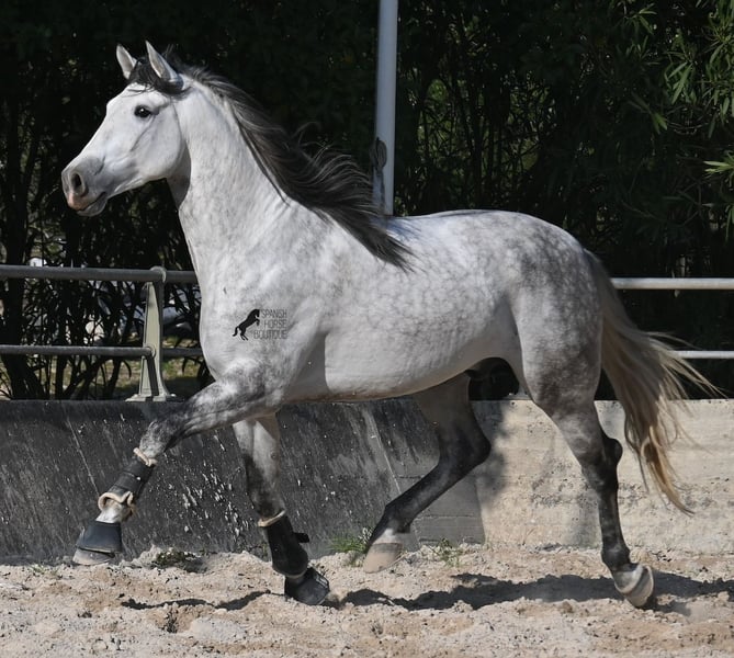 Dieser 2021 geborene PRE Hengst (Andalusier mit Rassenachweis der ANCCE) ist ein Bilderbuch-Spanier! Schön barock, wallende Mähne, spanischer Esprit, waches aber sanftes Auge und ein graziler Kopf. Dazu bewegt er sich noch unfassbar gut, er fliegt wirklich nur so über den Platz, wie ich es selten bei einem Spanier gesehen habe. Das kommt nicht von ungefähr, denn er ist ein Sohn des weltbekannten Dressurmeisters ROMERO DE TRUJILLO! Der Papa räumt alle Schleifchen und Preise ab, die es in der Dressurwelt des PRE zu ergattern gibt und dieser sein Sohn, hat auch großes Potenzial, um dressurambitionierte Reiter glücklich zu machen. Dazu kommt noch JUDIO VII als Großvater, der bis heute einer der wichtigsten Hengste der Rasse war und vermutlich für immer unvergessen bleibt. Daher kommt dieses klassische-spanische Exterieur und das Leuchten in den Augen, denn die Judios sind weltklasse Pferde, auch in der Morfologie und sehr sehr beliebt in der Welt des PRE. Der junge Mann misst schon stattliche 167cm (wächst noch!) und da es dem Züchter wichtig ist, dass seine Pferde langsam heranwachsen und nicht überfordert werden, war er lange in der Hengstherde auf vielen Hektar Land und ist aktuell basis angeritten. Er ist sehr arbeitssam, man braucht nur etwas Feingefühl sein Feuer zu zügeln,und noch tut er sich etwas schwer, immer zu 100% aufmerksam zu sein, was aber absolut normal ist, für ein Jungpferd mit Energie. Ohne Zweifel ist dieser Hengst eine hervorragende Option für ambitionierte Reiter die das spanische Pferd und die Dressur lieben, sowie für Züchter! Er ist bereits gekört, hat aber noch nicht gedeckt. Sollte Hengsthaltung nicht möglich sein, besteht die Möglichkeit der Kastration vor Ort. Preis der Qualität entsprechend! Aktuell steht er auf Mallorca! Videos und Abstammung gerne auf Anfrage. Ein Top Pferd zu einem sehr fairen Preis. Gerne organisiere ich vor Ort eine AKU, Beritt, Transport oder auch ihre Reise, sollten Sie persönlich zum Anschauen kommen. Details dazu gerne auf meiner Seite oder im Gespräch. Saludos aus Spanien