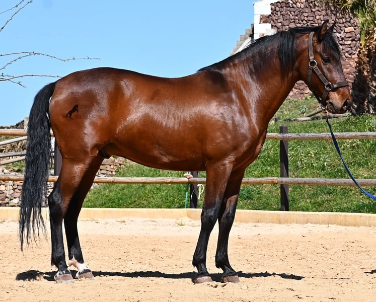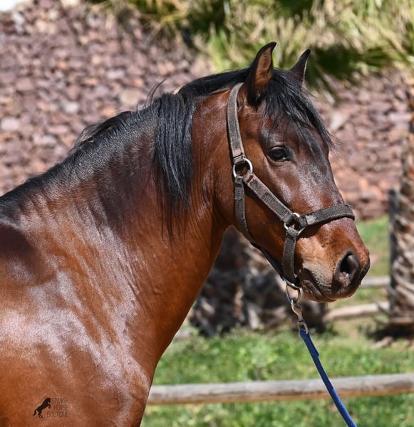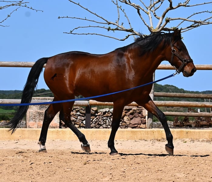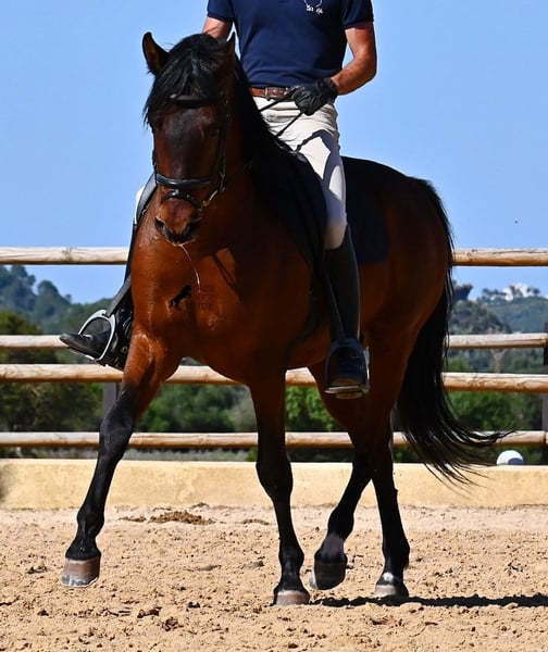 Dieser 2020 geborene, reinrassige PRE Hengst (Andalusier mit Rassenachweis der ANCCE), ist ein richtiges Powerpaket der nur so vor Elan bei der Arbeit strotzt! Er kommt von einem liebevollen Züchter, wo Spätentwickler wie die Spanier, das bekommen, was sie wirklich brauchen- Zeit! So ist er bis 3 in der Hengstherde komplett roh gestanden, wurde dann kurzzeitig aufgestallt, um die Basics zu lernen und dann wieder in den Urlaub entlassen, um alles mit Zeit zu verarbeiten. So hat er aktuell eine gute Basis unter dem Sattel, wo besonders darauf geachtet wird, dass er gut zu differenzieren lernt, zwischen seinem Vorwärtsdrang und Ruhephasen unter dem Reiter. Er lernt immer besser, sich selbst zu tragen, sich zu strecken und Ruhephasen zu verlängern, was sehr schön zu sehen ist. Ein Pferd, dass nicht in der Ausbildung gehetzt wurde, sondern sich erst finden darf und lernt die Energie zu lenken. Und Arbeitswillen hat er ohne Ende! Wo anderen schnell die Puste ausgeht, gibt er mehr und ist unermüdlich, womit er bestimmt ein Ideales Pferd für sehr ambitionierte Reiter ist, die gerne regelmäßig und gezielt trainieren. Geritten wird er auf doppelt gebrochener Wassertrense und ist nur an den Vorderhufen beschlagen. Nachts lebt er auf einem Hengstpaddock, was seinem Kopf auch sehr gut tut und tagsüber ist er in der Box für fürsorgliche Pflege und die korrekte Fütterung ist so besser garantiert. Ausritte auf dem hektargroßen Areal tun ihm auch gut und man merkt richtig, wie er da in seine Mitte findet, als positive Abwechslung zum Viereck. An leichten Arbeitstagen geht er in die Führmaschine und wird auch so weiter bemuskelt, ohne Gewicht zu tragen. In seiner Abstammung finden wir Ausnahmehengste wie YACO de TORRELUNA, ERMITAÑO III und sein Bruder ist sehr erfolgreich in der Dressur und hat es sogar zum SICAB (Weltmeisterschaft der PRE) geschafft. Er hat noch nicht gedeckt und kennt es, in der Nähe von Stuten zu sein, wobei die Option der Kastration vor Ort, selbstverständlich besteht. Aktuell misst er 157cm und hat ein schön barockes Exterieur, mit einem feinen Spanierkopf und guten Bewegungen, die ihn für viele Sparten mit hohem Arbeitsniveau interessant machen. Preiskategorie E! Sein Standort ist Menorca. Videos und Abstammung gerne auf Anfrage. Gerne organisiere ich vor Ort eine AKU, Beritt, Kastration, Transport oder auch ihre Reise, sollten Sie persönlich zum Anschauen kommen. Details dazu gerne auf meiner Seite oder im Gespräch. Saludos aus Spanien