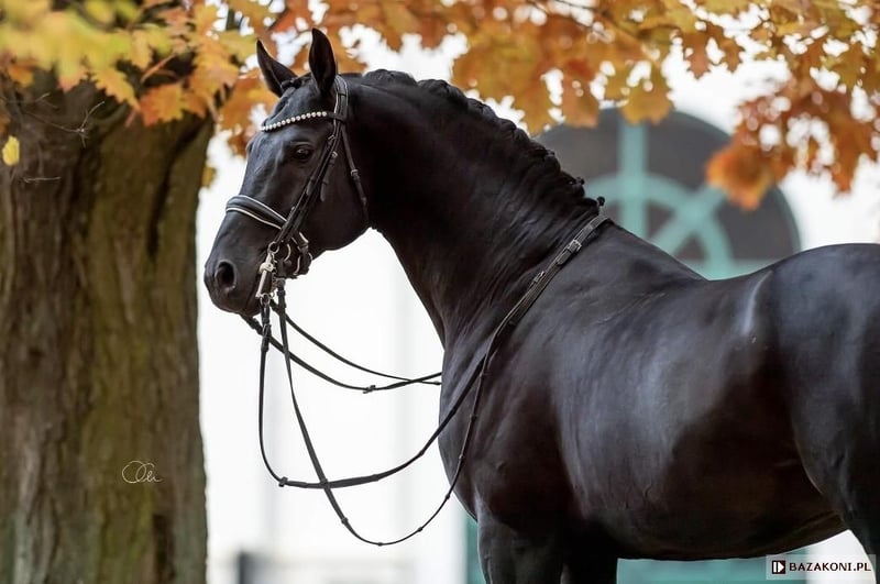 For sale 1,5 yo lovely stallion in BLACK HOMOZYGOUS color (DNA tested) He is by Emark - amazing black dressage polish stallion, compete in high level. (last picture) Also many more best Anglo Arabian horses such as Jalienny , Efekt, Veritas etc...in the pedigree, suitable for dressage, eventing or breeding ! Grandsire The Anglo Arab stallion All That Jazz was imported to Biddesden from Victoria in Australia as a colt. His sire is the Arab stallion SS City Lights who was bred in the USA and nearly 16 hands. His dam is Belingo, an Australian Thoroughbred by Saulingo. Jazz was always a tall colt with great scope to his stride. He has the softest and springiest of canters as all who have been lucky enough to ride him will attest. He was taken through the ranks to advanced level in British Eventing by William Fox-Pitt and went hunting for a season with the South and West Wilts. His foals have been successful in the show ring and have made a promising start in eventing, with their big strides and elegant steady head positions. Also australian, both arabian and thouroughbred horses are well known and appreciated for their hardness and durability and have achieved many successes in international endurance ! LORENZO AA is Of exceptional beauty , long-legged and well built, with elastic and extensive movement. Long neck, beautiful subtle head. He is now 164/5 cm high at 1, 5 yo cm, and final estimate height about 173/5 cm !!! Born and raised on big meadows, pastured every day with a group of youngsters. he has exceptional fantastic character, absolutely people oriented, very friendlty and calm. Full papers, e-passport, vaccinated, dewormed etc. He will be sold ONLY TO A BEST HOME ! Located western Poland near PL/D border . Transportation can be arranged . Contact by WhatsApp + 48 513 179 245