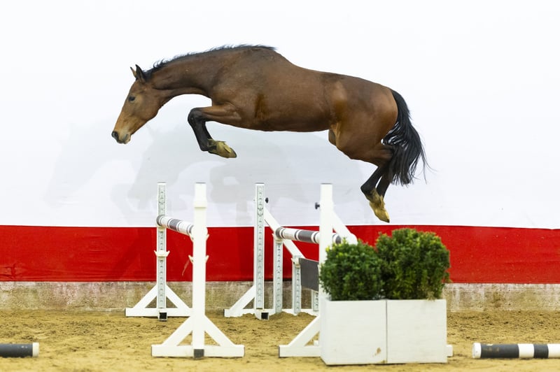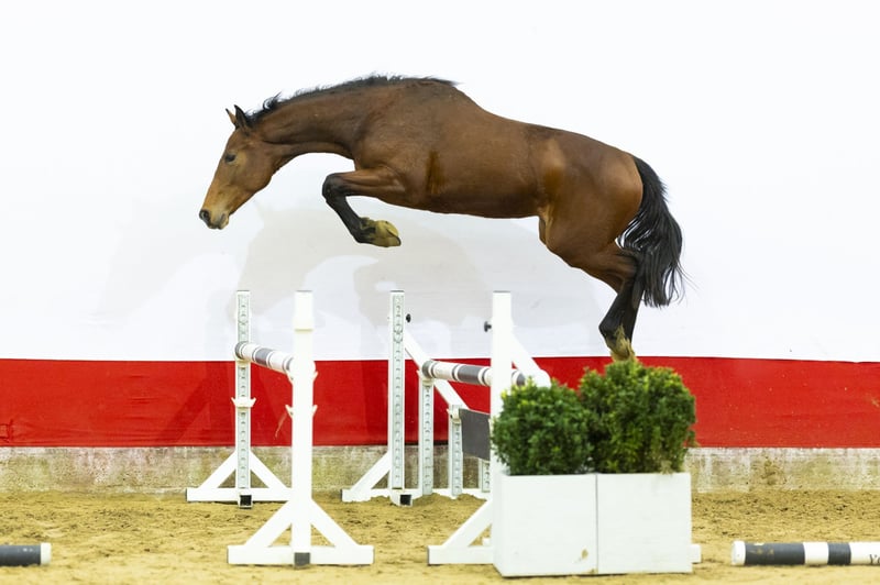 A highly interesting mare with strong blood expression. She is very light-footed and canters like a thoroughbred. Her canter is uphill, balanced and easy to adjust. She moves well and naturally stays in balance. Towards the fence she keeps overview and maintains her rhythm. She jumps with a beautiful technique and an excellent bascule. Her hindleg technique is strong and she shows plenty of scope. She uses her body correctly and finishes the jump in a very good way. In our opinion she is interesting for showjumping due to her canter, lightness and mindset. Additionally, she is interesting for breeding.
