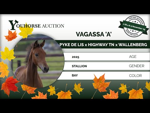 Dit hengstveulen liet thuis al zien waar zijn toekomst ligt: hij sprong spontaan over een hek in de weide. Als dat geen belofte voor de springsport is! Vagassa ‘A’ is een mooi naar boven gebouwd veulen met veel uitstraling. Hij beweegt lichtvoetig en toont het type dat straks comfortabel te rijden zal zijn. De trotse fokker leverde zelfs een video van deze sprong aan, die inmiddels ook online te bekijken is. Vader Pyke de Lis is pas vijf jaar, maar springt nu al op 1.25m niveau. Hij is een volle broer van Ansingh de Lis Z (1.40m) en Neeson de Lis (1.35m). Deze stammen uit de halfzus van de Grand Prix-paarden Uppie de Lis (1.60m) en Willink (1.60m) – beide succesvolle internationale toppers. Moeder Nagazza A is een dochter van de veelgevraagde Grand Prix-hengst Highway TN, winnaar van de Rolex Grand Prix in Den Bosch met Willem Greve. Grootmoeder Egazza (Wallenberg) voert op haar beurt de genen van de internationale sportmerrie Bagazza M (Quidam de Revel x Ramiro Z), die onder Dawid Kubiak (POL) actief was op 1.60m niveau. Met zulke prestaties van beide kanten van de pedigree is Vagassa ‘A’ een hengstveulen dat in de toekomst alle kansen heeft om zich te ontplooien tot een sportpaard voor het hoogste niveau.