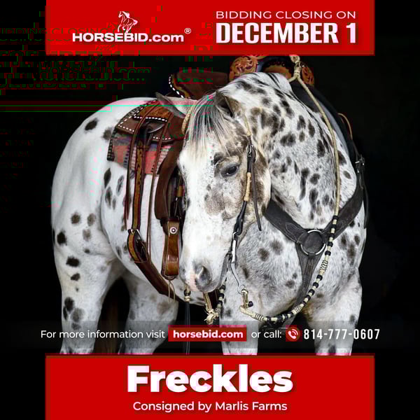 ⚜️ 𝓽𝓱𝓮 𝐇𝐨𝐫𝐬𝐞𝐦𝐚𝐧'𝐬 𝓢𝓱𝓸𝔀𝓬𝓪𝓼𝓮⚜️ Happening now thru MONDAY | DECEMBER 1st - Available EXCLUSIVELY on HorseBid's website! For more details and to register visit: www.Horsebid.com CONSIGNOR CONTACT: Marlis Farms 814-777-0607 LOCATION: Rebersburg Pa BREED: Appaloosa REGISTERED: Yes REGISTERED NAME: Harlequin Cougar COLOR: Leopard HEIGHT: 15 AGE: 12 GENDER: Gelding HARLEQUIN COUGAR barn name “Freckles” is a 12 year old registered Appaloosa gelding who is as pretty, smart and talented as they come! He has that goofy, bubbly, “golden retriever” personality that so many people wish for! Freckles is very well broke and educated. He has spent a lot of time in the show ring and has won many ribbons in 4H club! He has done the showmanship classes, trail course challenges, gaming events and hunter classes! Freckles is also very well seasoned on the trails and takes any obstacle with ease. We have exposed him to a lot around the farm and nothing much phases him - cattle, dogs, tarps, balls, scooters, bikes, ATVs, tractors, trucks, kids etc! This is a horse that has been there done that and will enjoy it everytime! He loves to be with his people and really aims to please. Freckles is the sweetest horse in the barn, he loves being groomed and doted on and will literally fall asleep while getting his mane braided! Always the first one to greet you in the morning and easy to catch! He gets along in a mixed herd but stalls well also. He’s a pretty easy keeper on an all-forage based diet. No maintenance or supplements and no vices or bad habits. He is a good boy for all the normal barn tasks and he’s excellent for the vet, farrier and dentist! If you think Freckles is your match - feel free to contact Mark @ 814-777-0607 with any questions or to schedule a visit! Calls only please, no texts.