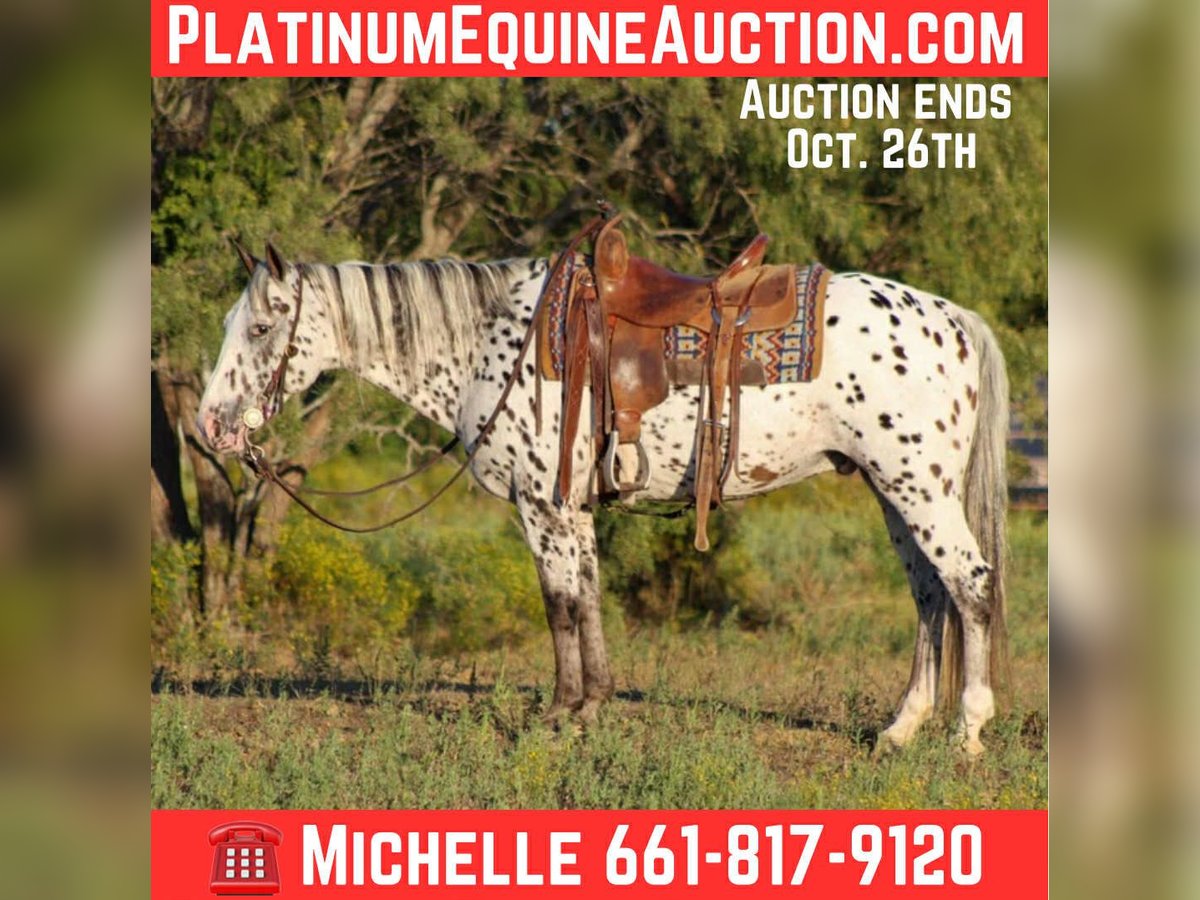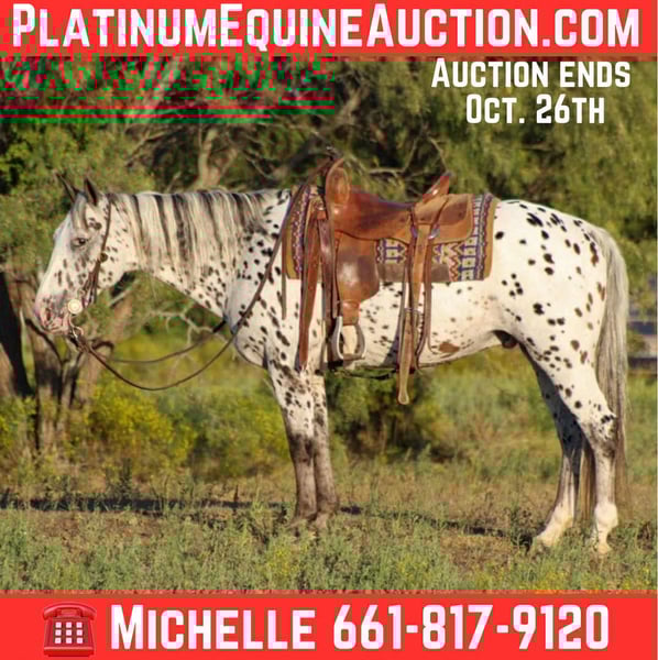 ONLINE AUCTION Place your bids at www.PlatinumEquineAuction.com Starting Bid $3500 Auction ends October 26th, 2025 Need a new saddle? Check out White Rock Saddles on our website or Facebook If you’re looking for a fun, flashy, and all-around good guy to hit the trails with, A1 might just be your perfect match! This handsome leopard Appaloosa gelding is 13 years old and stands 14.1 hands tall. He’s the ideal size—not too big, not too small—and he’s got a big heart to match his unique color! A1 is broke in the arena at a walk, trot, lope. But where he really shines is out on the trails. He’s been on camping trips, cruised down the side of the highway (yes, he’s seen traffic!), and he’ll confidently cross water, logs, and bridges without hesitation. He’s even dabbled in trail course obstacles just for fun! He’s easy to load, hauls great, stands tied, and picks up all four feet like a gentleman. Just an easy, no-drama kind of guy. A1 has that “look at me” presence that’ll make your friends and neighbors wish they had a horse this cool. He’s just one of those horses you can’t help but love. We are open to anyone interested in him to schedule a time to come see him or if you can’t make it schedule a FaceTime showing to see him. If you need help with transport don’t hesitate to ask we have a list of reputable haulers that can get him safely to your doorstep WORLD WIDE including, Alaska , Mexico, Hawaii, Canada and anywhere in between from Stephenville, TX. Contact Michelle with M $ Performance Horses 661-817-9120 with any questions. ONLINE AUCTION Place your bids at www.PlatinumEquineAuction.com Starting Bid $3500 Auction ends October 26th, 2025 Need a new saddle? Check out White Rock Saddles on our website or Facebook