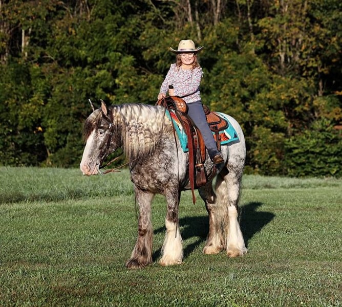 Consigned to Cowgirl Cadillacs in Sheridan, WY. Sales June 14-15th. You can bid online, phone bid or bid in person! Have you been waiting for a knight in shining armor to sweep you away? DANTE STEEL KNIGHT is what you have been waiting for! With a unique roan/appaloosa coat, fluffy feathered legs, poofy mane and tail, loving personality and a heart of gold, even the medieval era did not have a knight like this!!! Over the last year with us Dante has stole the hearts of our little girls! He is Mr. Personality and Mr. Patient! He loves attention and grooming or anything that involves interacting with people! Dante is a well built 15hh, 5 year old, Appaloosa colored, registered Gypsy Vanner gelding! He has a smooth jog, a very nice lope, he reins around and turns a circle both ways, sides passes and backs with ease! Dante knows a trick or two as he lays down for mounting/dismounting. No wonder people love gypsies; their popularity is driven by their versatility and calm nature! Dante is a true ambassador of breed. Dante can go out and ease down the trails. He will cross deep water, rough rocky areas, scale steep slopes and pick his way over deadfall, all while keeping his rider safe! He has been used around the ranch to check cattle, sort pairs and he has roped/doctored calves as well. We have had him down the highways, through town and he is safe around all traffic. He has seen the bright lights and heard the loud speakers as we had Dante in a Christmas play called “Journey Through Bethlehem” which had around 250 actors in it. Dante was ridden as a roman soldier’s horse, for several hours, as he walked up/down rows of car loads of people. Of course folks were taking pictures and reaching out their windows to pet him. Over the 2 nights approximately 8000 cars drove through the “live nativity scene”. We have tested Dante in every way that we know how and he has passed every single test with nothing less than a perfect score! He has shown us that any age and any ability level can enjoy him. If you have been waiting for your knight in shining armor to arrive… HE IS HERE!!! Call 606-308-2461 for more info.