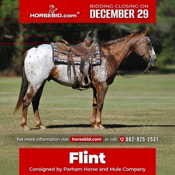 ⚜️𝐓𝐇𝐄 𝓗𝓮𝓻𝓲𝓽𝓪𝓰𝓮 𝐖𝐢𝐧𝐭𝐞𝐫 𝓒𝓵𝓪𝓼𝓼𝓲𝓬⚜️ Happening now thru MONDAY | DECEMBER 29th - Available EXCLUSIVELY on HorseBid's website! For more details and to register visit: www.Horsebid.com CONSIGNOR CONTACT: Parham Horse and Mule Company 662-825-2531 LOCATION: Amory, MS BREED: Appaloosa REGISTERED: Yes REGISTERED NAME: BOSS OUTLAW COLOR: Chesnut HEIGHT: 15 AGE: 8 GENDER: Gelding BOSS OUTLAW “Flint” Flint is an 8-year-old registered Appaloosa gelding standing 15 hands tall and weighing approximately 1,150 pounds. He is a well-made, athletic individual with the substance, balance, and mind that seasoned horsemen appreciate. Flint represents the kind of horse that has been thoughtfully developed, not rushed, and it shows in every aspect of his performance. This gelding has a strong foundation in cutting and reining, which is evident the moment you pick up the reins. He is exceptionally cowy, reads livestock naturally, and stays engaged without being overly reactive. Flint has a big, correct reining-style stop, smooth spins, and a handle that is both responsive and refined. He moves easily off your feet, stays soft through his body, and is very light in the mouth, making him enjoyable for experienced riders and forgiving for those still refining their timing. Flint has been used extensively in real-world situations. He has been roped off of, will rope both the head and heel side, and has been hauled to jackpots on the heel side, where he has proven to be reliable, focused, and confident away from home. He has also been team sorted, played on the barrel pattern, and ridden outside the arena, demonstrating versatility that is increasingly difficult to find in a single horse. On the trail, Flint is steady and confident, handling new environments with ease. He is the same horse whether working cattle, competing, or enjoying a quiet ride. He does not require constant management or reminders—he understands his job and goes to work willingly. Beyond his performance ability, Flint excels in the areas that matter long-term. He is easy to catch when turned out, gets along well with other horses, and handles daily care with no issues. He loads and hauls quietly, bathes, grooms, tacks up, and stands patiently in cross ties. He is good for the farrier and maintains a calm, cooperative demeanor that reflects consistent handling and a solid mind. Flint is the type of gelding that fits a wide range of programs—whether you’re looking for a dependable performance partner, a competitive rope or sorting horse, or a well-rounded gelding with the training and temperament to hold long-term value. He is not flashy for the sake of being flashy; he is correct, honest, and useful, which is exactly what discerning buyers look for. For those seeking a proven, versatile horse with training, ability, and a level head, Flint is one worth taking the time to consider. To schedule a visit with Flint, please contact Dustin Parham – 662-825-2531