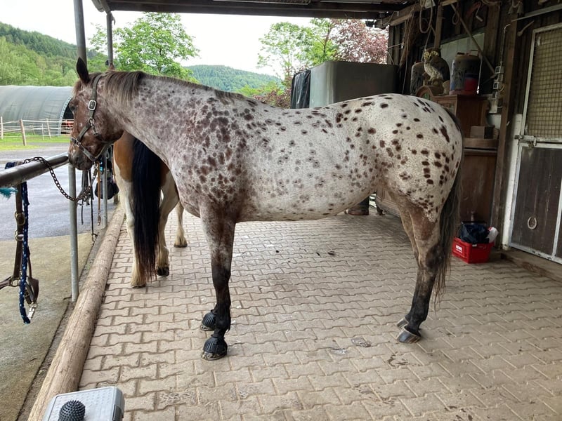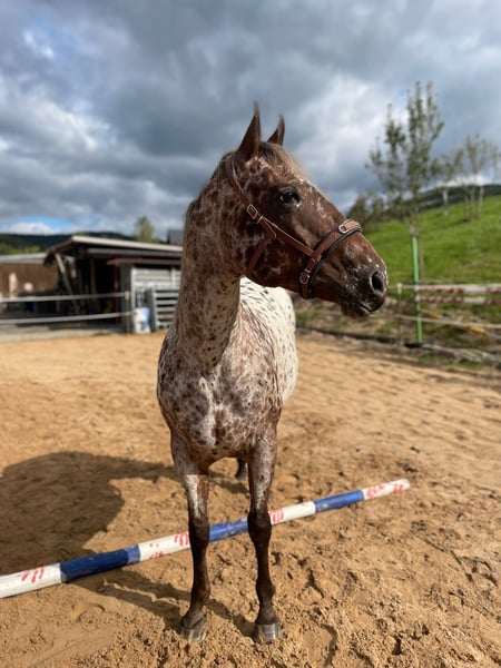 Ich suche für meine Stute Joy ein absolutes Traumzuhause Eckdaten: 10 Jahre alt, am 20.05.2015 geboren Appalossa x Quater Horse Mix mit Appalossa Papieren Ca. 156 cm groß Vor einigen Jahren Hufrollenbefund am linken Vorderhuf, welcher mit einem Spezialbeschlag gut behandelt ist. Sie ist freizeitmäßig, gebisslos geritten und ausgebildet, geht zuverlässig alleine und auch in der Gruppe ins Gelände und ist allgemein sehr motiviert und temperamentvoll. Sie braucht eine Person, die ihr Sicherheit gibt und selbstbewusst im Umgang mit Pferden ist. Allgemein kennt sie schon sehr viel aber wird bei unbekannten Situationen auch mal unsicher, bleibt dabei aber immer händelbar und kontrolliert. Sie ist sehr gut vom Boden aus gearbeitet, Freiarbeit, Lektionen wie Kompliment, liegen, „Schaukelpferd“ etc. ist kein Fremdwort für sie. Zudem wurde viel Handarbeit mit ihr gemacht, Schulter herein, Kruppe herein und Seitengänge jeder Art sind für sie kein Problem, auch nicht vom Sattel aus. Aufgrund ihres Hufrollenbefundes, wird sie nur noch im Gelände geritten, da sie vermehrt auf harten Böden geritten werden soll. Bei Hallen oder Platzböden kommt es ganz auf den Boden drauf an. Je nachdem fällt es ihr einfacher oder schwerer. Sie wird abgegeben, da ich die nächsten Jahre noch zum studieren weg bin und ihr aufgrund meiner zukünftigen Arbeit leider nicht die nötige Aufmerksamkeit und Fürsorge geben kann. Ich wünsch mir für sie jemanden, der sich vielseitig mit ihr beschäftigt, sie fördert und schöne Ausritte und abwechslungsreiches Bodenarbeitstraining mit ihr genießen möchte. Zudem steht sie im Winter im Offenstall und im Sommer 24/7 auf der Koppel. Keine Allergien, kein Spezialfutter oder ähnliches. Ich wünsche mir, dass sie wieder in einen Offenstall, Aktivstall oder auf die Koppel kommt. Sie wird nicht an Boxenhaltung oder Paddock abgegeben. In der Herde hat sie eher einen mittleren Stand und steht aktuell in einer gemischten Herde. Generell ist sie anderen Pferden gegenüber sozial und aufgeschlossen. Ich kenne Joy seit Geburt an und wünsche mir für sie einen Endplatz zu finden. Sie wurde selbst von mir ausgebildet und hat bereits mehrere Wanderritte, Reit- und Bodenarbeitskurse sowie Trails besucht. Sie ist auch in fremder Umgebung aufmerksam und zuverlässig. Keine Händler oder Reitvereinanfragen bitte, nur Privatpersonen. Gerne mit Fragen an mich wenden, generell kann mehr Auskunft bei einem persönlichen und telefonischen Gepräch gegeben werden. Preisvorstellung liegt bei 4800€VB Standort Nähe 63639 Flörsbachtal
