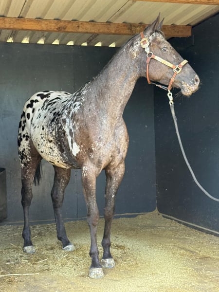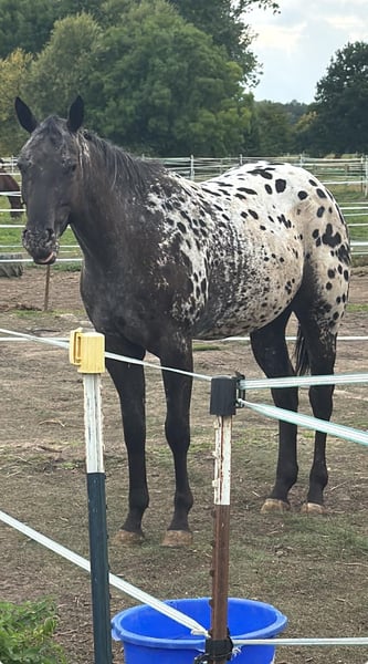This stunning Appaloosa mare without papers, featuring the exceptional Black-Blanket coat pattern, was foaled in 2022 and currently measures approximately 15.6 hands. She has an equine passport and impresses with her correct conformation as well as a particularly sweet and human-oriented character. The young mare is still in development but already shows a very calm, playful, and eager-to-learn demeanor. She is completely sound-sensitive, affectionate, and consistently well-behaved and easy to handle in daily interactions, as well as during vet and farrier visits. She is accustomed to both stall and pasture life, regularly dewormed and vaccinated, and has been trained with patience and calmness. Currently, she is in training and walks and trots politely under saddle. She also works enthusiastically on the lungeline and in groundwork. Her rhythmical, expressive gaits make her an interesting prospect for versatile activities—whether in pleasure riding, ranch riding, or trail. This young lady is the perfect partner for riders who want to develop their young horse into a reliable leisure or competition partner. She has the potential and attitude to become a true all-rounder. Training is included until November.