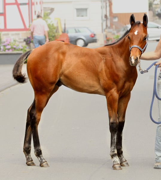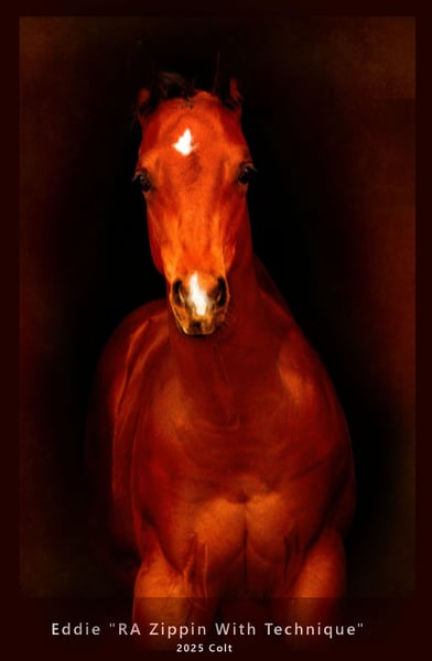 Eddie ist ein edles Hengstfohlen mit hervorragender Western Performance Abstammung. Sein Name "RA Zippin With Technique" verweist bewusst auf seine stark vererbte Quarterhorse-Blutlinie mütterlicherseits: Seine Dam "Shado With Technique" stammt aus einem ebenfalls kastanienbraunen, und sehr erfolgreichem Quarter-Horse Hengst namens "With Technique". Dessen "Sire" war ein ebenso erfolgreicher klassisch braun gefärbter AQHA Hengst namens Zippin Bonanza Flash. With Technique ist von Johannes Orgeldinger (Jomm Ranches) früh importiert und von der Familie Jagdfeld sehr erfolgreich vorgestellt worden. Er erreichte unter anderem einen Superior Pleasure-Titel, (wie sein Vater Zippin Bonanza Flash vor ihm). Als Legende der deutschen Quarter-Horse-Szene wurde er in die DQHA-Hall of Fame aufgenommen. With Technique's Potential zum Erfolg dankt er sicherlich seine Abstammung, die dafür bekannt war, seine Nachkommen so zu segnen. Dies ging noch zurück auf den berühmten Zippo Pine Bar (AQHA Hall of Fame), der ausgezeichnet wurde als: "All Time Leading Sire of Performance Register of Merit Quarter Horses". Diese Wahnsinns-Blutlinie begann mit seinem Vater Zippo Pat Bars (AQHA Hall of Fame) und lebt noch heute weiter. Aus derselben Mutter-Linie wie Eddie stammt auch der Ausnahme Appaloosa Hengst PM Royal Technique. Früh wird erkannt, was diese Blutlinie in sich trägt und, vorgestellt von Linda Leckebusch-Stark, führte dies zu einer langanhaltenden Erfolgs-Blüte, mit mehrfachen ApHC EM-Titeln, und auch bei der EWU, wo "Ryder" auch gegen viele andere Rassen wiederholt seine Fähigkeiten bewies, was den Stellenwert der Appaloosas sichtlich anhob. Eddie's Mutter Shado With Technique (Züchter Fam. Drees) hat mehrere Halb- und Vollgeschwister von Eddie produziert die erfolgreich auf Shows vorgestellt wurden - unter Sattel und im Halter (European Champions). Diese Erfolgslinie ist noch nicht verblüht: manche junge und genau so schöne Geschwister kommen sicherlich noch dazu. Eddie's Vater Mr Go Right "Rusty" (ApHC/ApHCG) ist ein erfolgreicher Allround-Appaloosa Hengst der "Top 5 in the World" in "Open Aged Halter Stallion", erreichte, sowie "High Point Horse" Titeln. Er ist auch in EWU-Klassen erfolgreich gewesen, und mehrfach "State Champion". Rusty's Abstammung beinhaltet auch viele Hall of Famers, meist Performers wie High Sign, aber auch ein wenig Halter - 2x Goer und Romans Straw Man liegen weiter zurück. Durch mehrere Reining, Cutting and Cowhorse Linien ( Ima Dazzalena / Ima Poco Olena (Hall of Fame) zeigt er besonders Talent für Ranch Riding. Seine Linie ergänzt sichtlich die eher Pleasure und Halter orientierte Linie der Mutter. Eddies Potenzial: beste Blutlinien in die Wiege gelegt, kombiniert mit exzellentem, glänzendem Exterieur für einen Wow-Effekt. Eddie ist schön und ausdrucksstark, korrekt und harmonisch bemuskelt aber dazu auch charakterlich klug, freundlich und lernbereit. Dies sind alle beste Voraussetzungen für ein prächtige Zukunft für Eddie mit dem richtigen Partner. Obwohl nicht unbedingt ein Muss, wäre Eddie besonders für Shows geeignet: Halter, Pleasure, Western Riding, Ranch Riding oder Allround. Eddie wächst in unserer Familie auf, ist bestens geprägt und zeigt schon jetzt Talent. Besichtigung möglich: Mutter, Vater und zwei Vollgeschwister können auch angesehen werden bei uns in Hessen. 5 Panel N/N