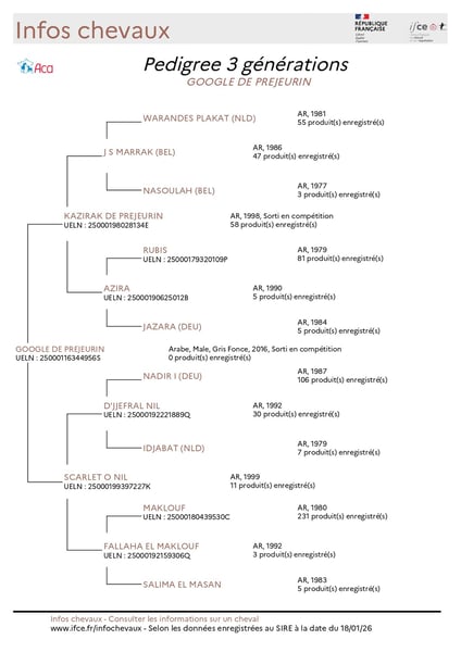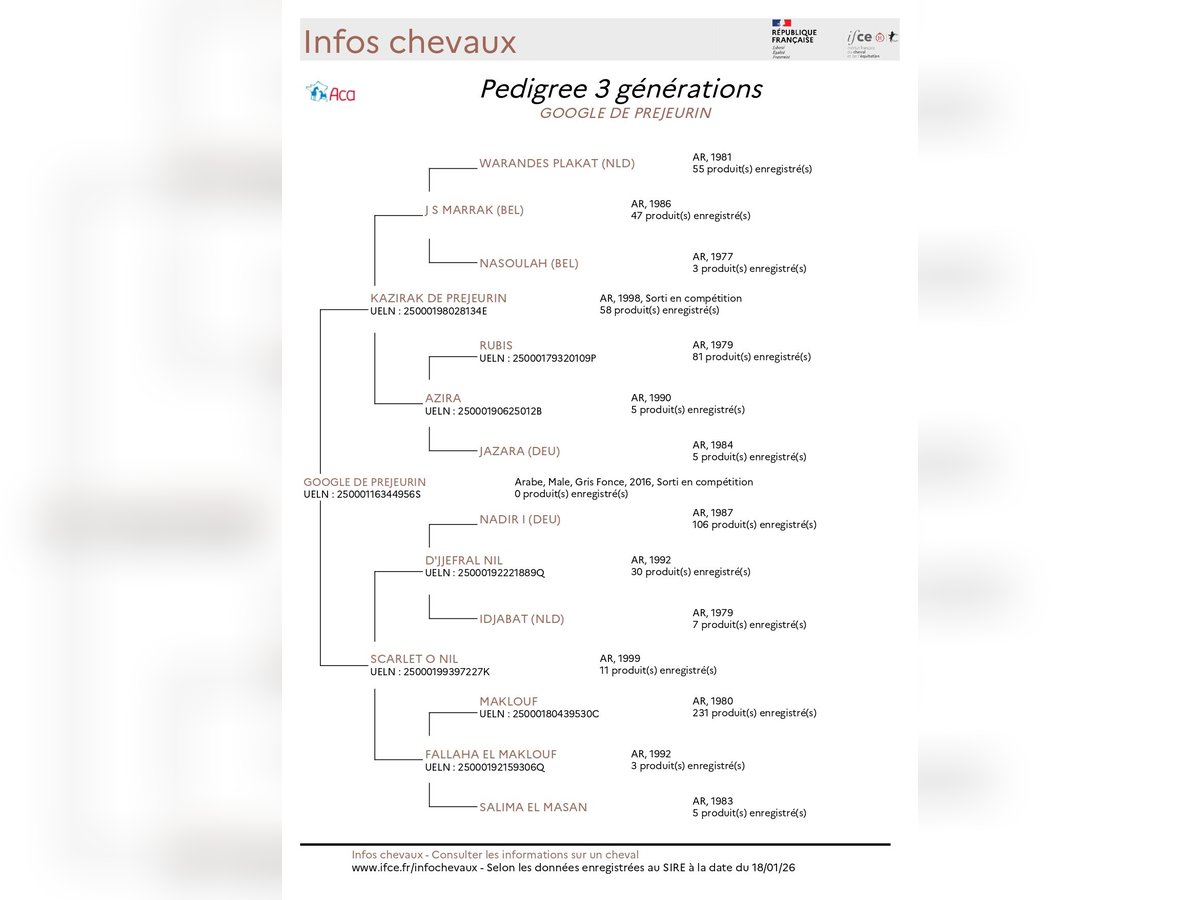 GOOGLE DE PREJEURIN Arabian hongre, 1.52m, CEI1* qualified "Hello, If you are looking for a horse with an elite metabolism and proven genetics, I would like to introduce Google de Prejeurin. He is a 10-year-old gelding, large in stature, with a dark grey coat. He has just secured his international qualification at the 80 km event in Saint-Barthélemy-de-Vals, where he finished 4th. His recovery ability is his greatest strength: he recorded a time of 4 minutes 13 seconds after 80 km with a heart rate of 60 bpm. In terms of his lineage, he comes from a very solid Maklouf line via his sire, Kazirak de Prejeurin. Above all, Google is the full brother of Ubayan de Prejeurin, who clocked 18 km/h at the World Championships and finished on the podium in CEI**. His dam is a proven performer who produces horses with exceptional longevity in competition. Google is ready to tackle CEI1* events. He is a horse with a bright future, possessing a cool head and plenty of drive. He knows how to pace himself and remains very easy to handle on the course. Google is also very easy to handle on a day-to-day basis (clipping, shoeing, transport, etc.). I have attached some photos and videos. Please do not hesitate to contact me if you have any further questions. I look forward to hearing from you, Kind regards, 0658676210 Noémie DOUCET/ ND HORSE TRAINING
