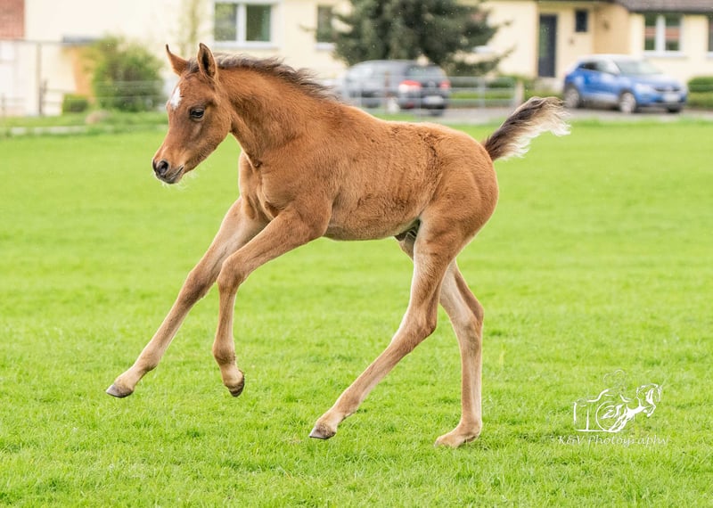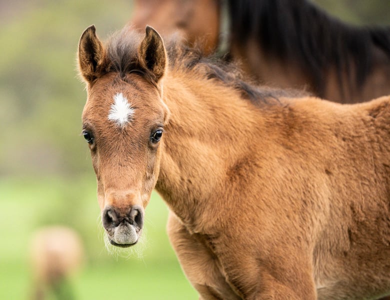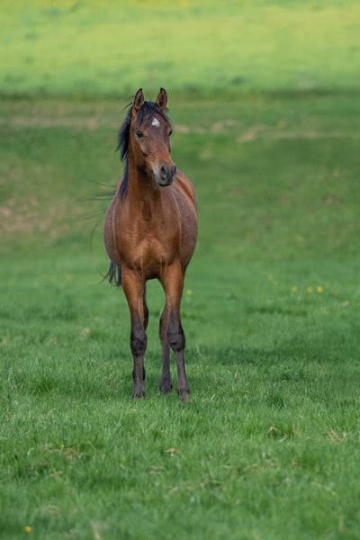 Stylish and extremely correct young Arabian colt in a bay jacket. Kalit is a very curious and open-minded foal, fearless, people-oriented and with a friendly character. He is growing up with other mares and foals and is excellently socialized. He has already learned the basics of foal training, i.e. touching everywhere, haltering, lifting legs, etc. It goes without saying that our foals are wormed regularly, are already microchipped and receive a pedigree certificate and an equine passport. If desired, he can continue to be raised by us or move to a new home from around October. Kalit would be delighted to receive a visit. Please contact us.