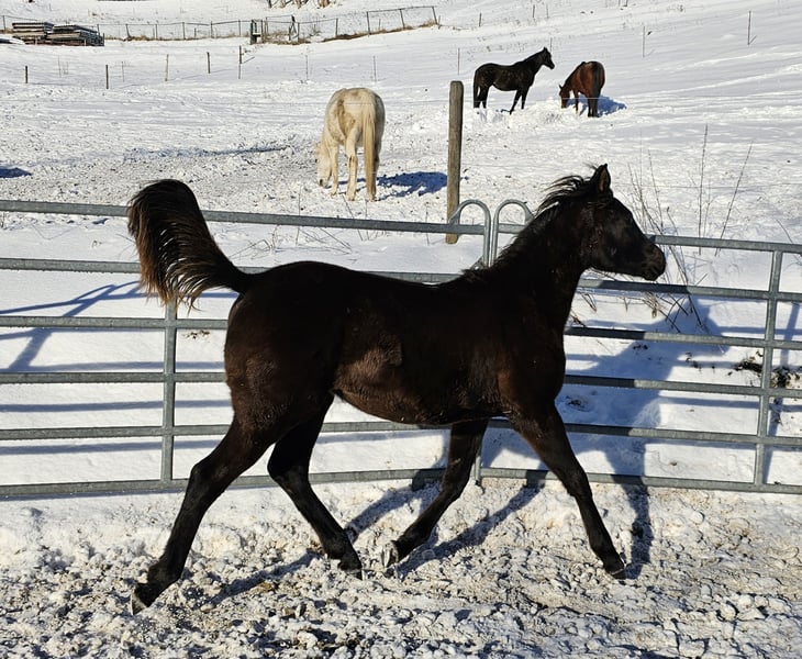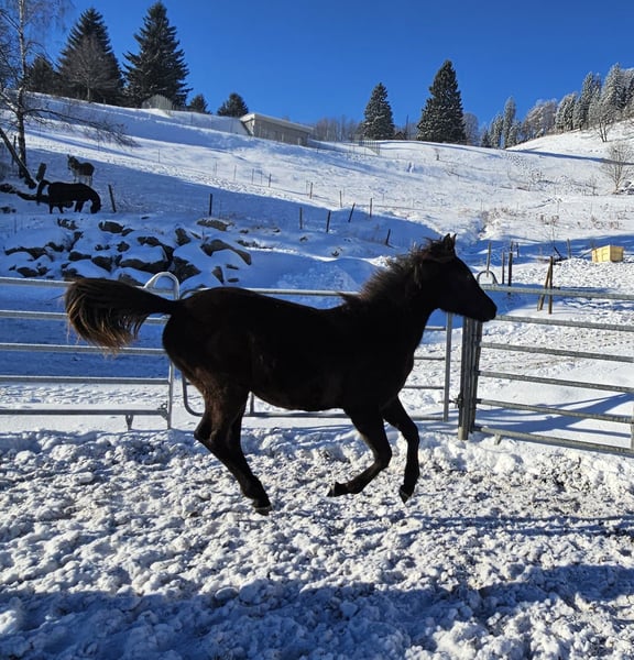 Verkaufe eine wunderschönes Vollblutaraber-Stutfohlen. Momentan im Winterplüschmantel. Zum Verkauf steht eine elegante und edle Vollblutaraber-Stute, geboren im Jahr 2025. Sie ist eine beeindruckende Rappstute mit einer beeindruckenden Erscheinung und viel Potenzial für die Zucht. Diese Stute zeichnet sich durch ihre typische arabische Schönheit, ihre gute Abstammung und ihr freundliches Wesen aus. Sie ist bestens für die Zucht geeignet und bietet eine hervorragende Grundlage für die Zuchtlinie. Sahira wurde als Saugfohlen vom ZSAA prämiert Ihre Mutter Thaldschiyya von der Büreten stammt aus der aussterbenden Stutenlinie der Armenia, was Sahira als Zuchtstute noch interessanter macht. Ihr Vater ist unser goldprämierter Rapphengst Al Shahar al Azim, der durch sein sanftes Wesen und seine herrausragenden Gänge besticht. Bei Interesse stehe ich gerne für weitere Informationen und eine Besichtigung zur Verfügung.