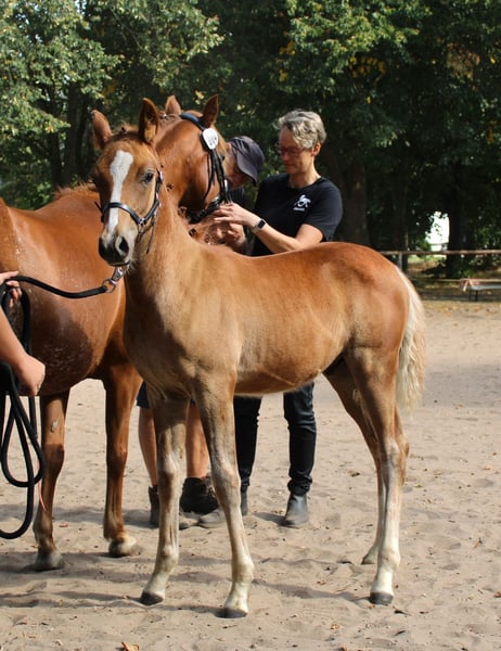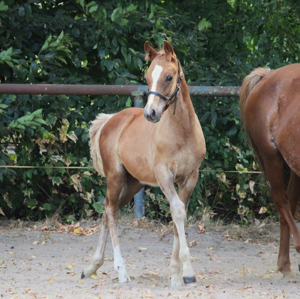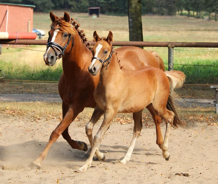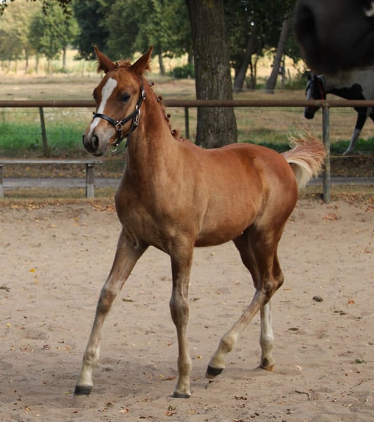 Verkauft wird ein wunderschönes Hengstfohlen mit Fohlenprämie. Wir freuen uns, Ihnen ein wunderschönes Reitpony x Vollblutaraber Fohlen aus diesem Jahr mit halbem Papier vom ZSSE anzubieten. Dieses bezaubernde Hengst stammt von einem Vollblutaraberhengt, der erfolgreich am 30-Tage-Test in Handorf teilgenommen hat und durch seine ausgezeichneten Eigenschaften überzeugt ab. Die Mutter des Fohlens ist eine Reitponystute mit sehr guten Grundgangarten. Unser Hengstfohlen wurde regelmäßig entwurmt, hat bereits positive Erfahrungen beim Hufschmied gesammelt und wächst glücklich im Herdenverband auf den Wiesen auf. Es zeigt ein aufgewecktes und ausgeglichenes Wesen, perfekt für zukünftige Herausforderungen. Altersentsprechend ist es komplett roh und bereit, vielseitig gefördert zu werden. Endmaß des Fohlens vorraussichtlich ca. 148 cm. Wir sind nicht nur auf der Suche nach einem Käufer, sondern nach den idealen Menschen, die diesem besonderen Hengstfohlen ein liebevolles Zuhause bieten können. Bei Interesse freuen wir uns sehr über Ihre Nachricht! Für weitere Fragen oder zur Vereinbarung eines Besichtigungstermins stehen wir Ihnen gerne zur Verfügung.