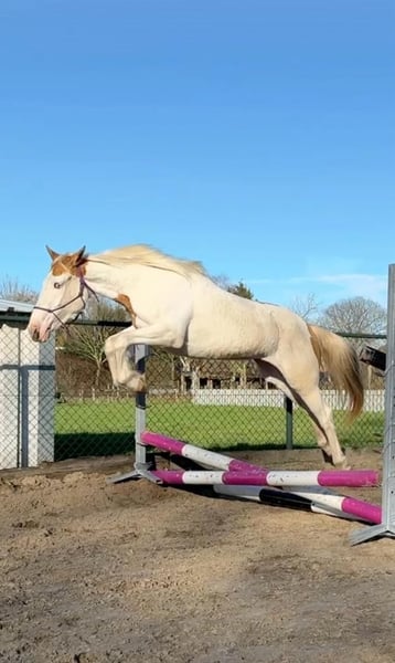 🌟 Niagara Faux Miroir 🌟 Unieke verschijning! 2,5-jarige merrie met uitstraling en kwaliteit! Niagara Faux Miroir is een 2,5 jarige merrie van 1,55 ± en groeit nog door, Haar kleur is palomino pie en ze heeft 2 blauwe symmetrische ogen Niagara is qua afstamming een zeer interessante merrie ook interessant voor de fokkerij! Niagara is zowel geschrikt voor de westernsport & dressuursport en doet ook een leuk sprongetje. Ze heeft veel respect aan de hand, mensgericht & heel nieuwsgierig ze schrikt niet gauw. Ze is bekend met grondwerk en clickertraining. Ze snapt de beginselen van het longeren en balkjes draven ze heeft correcte gangen en droge pezen. Haar vader is de bekende hengst Vanadoo Blue eye, ingeschreven in het cremello stamboek. Haar volledige afstamming is bekend Ze komt uit de fokkerij van de gerenommeerde Franse fokker Alain Francart Geen stalgebreken of andere mankementen Wij zoeken voor Niagara een fijne, liefdevolle plek waar ze verder mag uitgroeien en ontwikkeld worden.