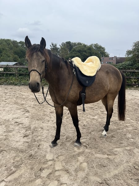 Wenn Alles passt, biete ich meine 9 jährige Partbred Araber Stute in der Farbe Buckskin zum Verkauf an. Sie ist ein sehr feines Pferd und ich bin sie bisher nur gebisslos geritten. Wir haben viel Bodenarbeit und Natural Horsemanship gemacht. Ansonsten sind wir in erster Linie freizeitmäßig im Gelände unterwegs gewesen. Ich habe sie auch hin und wieder für die therapeutische Arbeit eingesetzt. Sie kann tiefenentspannt sein, allerdings genauso arabertypisch temperamentvoll. Und sie hat auch den „Turbogang“, soll heißen, sie ist sehr schnell und bewegt sich gerne. Bei mir stand sie immer im Offenstall und das würde ich mir für sie auch weiter wünschen. Sie braucht allerdings einen sicheren Platz im trockenen Unterstand, da sie tendenziell rangniedrig ist und gar nicht gerne im Regen steht. Alternativ wäre nachts Paddock-Box und tagsüber Weide sicher auch ok für sie. Sie läuft barfuß (vorne zieh ich ihr für Ausritte Hufschuhe an) und lässt sich ohne Probleme die Hufe bearbeiten. Sie wurde regelmäßig geimpft, entwurmt und die Zähne jährlich gemacht. Ein- bis zweimal im Jahr bekommt sie eine ostheopatische Behandlung. Da sie tendenziell eine hohe Körperspannung hat, gebe ich ihr gelegentlich während des Putzens kleine Massagen. Auch wenn sie ordentlich aufdrehen kann, ist sie zu jedem Zeitpunkt am langen Strick supergut zu halten. Bei mir stand sie zuletzt in einer Stutenherde. Sie kennt aber auch gemischte Herden. Sie ist keine Gewichtsträgerin. Ich würde sagen bis maximal 70 kg kann sie gut tragen. Ich gebe sie nur in beste Hände ab – es ist kein Notverkauf. Sie kann wohl auch viele verschiedene Farbgene vererben. Auf dem letzten Bild ist ihr Vater, Paintabian "Shicco Ibn Shai" Ich habe für sie einen extra angepassten Deuber Jerez in Größe S2 (Bückeburger Modell), der separat dazu erworben werden kann.