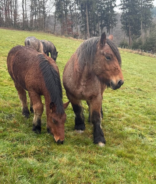 For sale is a 4-year-old (born May 2021) Ardennes mare, approximately 150 cm tall, with a beautiful coat and a strong build. She has previously foaled and is currently in foal again for 2026. A breeding license is available. She has an excellent and full pedigree. She is very well-behaved in handling and could easily be used as a riding or driving horse soon. She has not been worked yet. Her temperament is calm and gentle, and she accepts handling and loading without issues. The small brown stallion is also for sale. No known health issues or allergies. An ultrasound examination can be performed upon request. Please feel free to call or send a message to 0157 36803742. All information is provided without guarantee. Prices are subject to change. Transport can be arranged, and online purchase is possible.