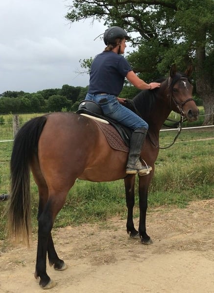 Sicherlich zwischen 1,55 und 1,60 m groß im Erwachsenenalter, hat dieses Fohlen ein Fuchsbraunes Fell, das mit dem Alter sicherlich dunkler wird. Sie trägt das Dun-Gen, das von ihrem Vater vererbt wurde. Als sportliche Nachwuchshoffnung hat sie eine harmonische und elegante Morphologie mit einem feinen, hochgetragenen Hals. Ihre Gänge sind luftig und leicht, mit viel Schwung und Balance. Dynamisch und sehr lebhaft zeigt Kymee einen ausgeglichenen, selbstbewussten und neugierigen Charakter. Ihre Vielseitigkeit, Agilität und Lebhaftigkeit werden Vorteile in sportlichen Disziplinen wie Springen, Dressur, Vielseitigkeit oder Distanzreiten sein. Seit März 2025 ist sie angeritten und wird auch im Freilauf, am Boden und mit langen Zügeln gearbeitet. Ihr Preis entwickelt sich mit dem Fortschritt der Ausbildung. Wie alle unsere Pferde ist dieses Fohlen geimpft, entwurmt, mit Ergänzungsfuttermitteln versorgt und wird regelmäßig in der Zahnmedizin sowie in der Osteopathie betreut. Alle unsere Fohlen werden gehandhabt, in Gruppen aufgezogen und vor allem spät, etwa mit 10 oder 11 Monaten, abgesetzt, um ein ausgewogenes Wachstum zu fördern. Mehrere andere Pferde sind im Zuchtbetrieb zum Verkauf verfügbar und auf der Website des Haras du Grémillon einsehbar. Zögern Sie nicht, per SMS Kontakt aufzunehmen, um weitere Informationen zu erhalten.