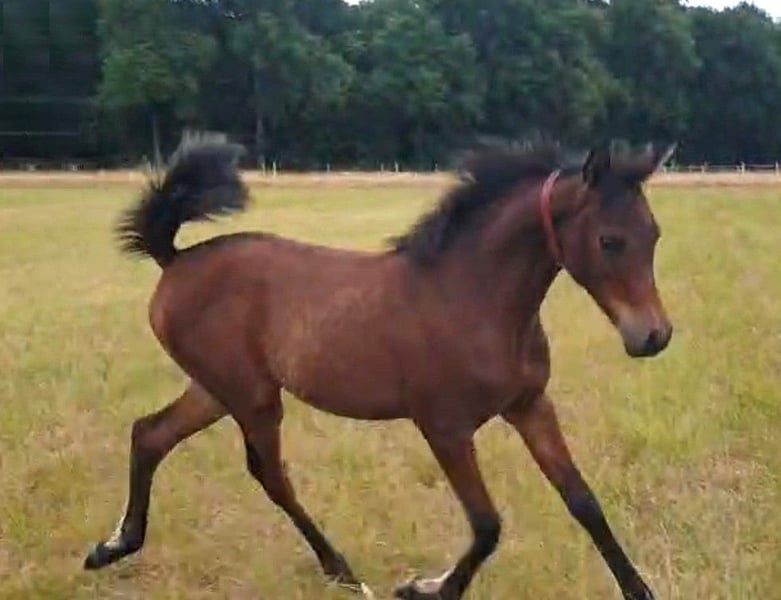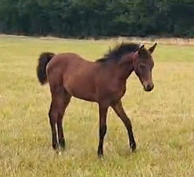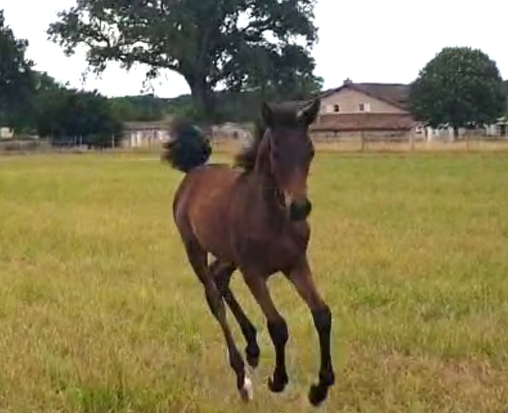 Sehr schicke Fohlenstute mit brauner Fellfarbe (Dun-Gen festgestellt). Wie ihre Mutter und ihre Schwestern hat sie einen hübschen, kurzen Kopf mit breiter Stirn, ein konkaves Profil, ausgeprägte Fesselbeugen, kleine Ohren und große, ausdrucksvolle Augen. Farah zeigt schöne, weite, leichte und raumgreifende Bewegungen, ihr Galopp ist rund. Energiegeladen, mutig, aber freundlich und ausgeglichen, zeigt sie einen neugierigen und schmusigen Charakter. Aufgrund der Größe ihrer Eltern wird sie im Erwachsenenalter etwa 1,55 m messen. Wie alle Fohlen ist sie bereits gehandhabt, geimpft, entwurmt und mit Ergänzungsfutter versorgt. Sie wurde in der Gruppe aufgezogen und wird spät abgesetzt, ist aber bereits jetzt reservierbar. Ihr Preis steigt mit dem Alter und dem Fortschritt der Ausbildung. Mehrere andere Pferde stehen zum Verkauf im Zuchtbetrieb zur Verfügung. Zögern Sie nicht, die Website des „Haras du Gremillon“ zu besuchen und per SMS Kontakt für weitere Informationen aufzunehmen.
