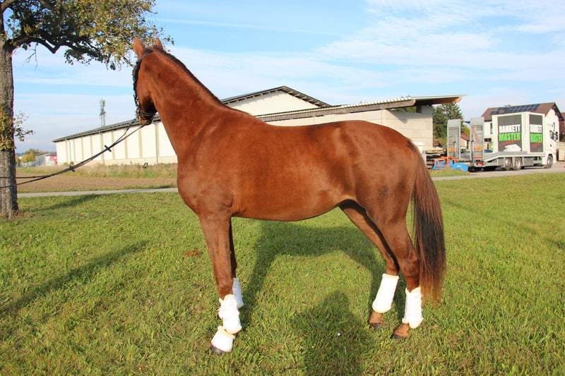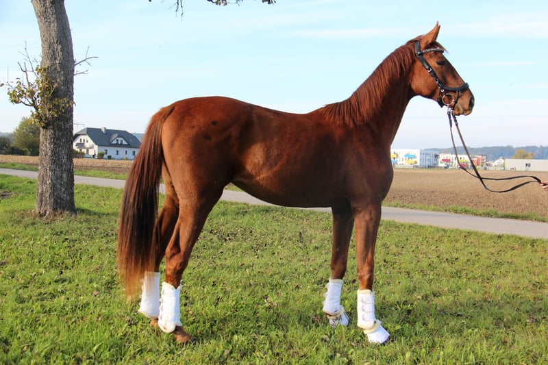 Nearly 3-year-old promising young sports horse of exceptional quality seeking a new home. ⭐️ Our “Felicio” will turn 3 next year and is at the perfect age to start gently preparing him for a successful career as a dressage horse. This handsome chestnut (already gelded!) was born on April 20, 2023. He is sired by Feliciano (modern, correct conformation combined with excellent temperament, winner in young horse classes with scores up to 9.2, multiple wins in DPA and DPL, as well as qualification for the five-year-old dressage horse national championships in Germany, among others) out of a Destano mare. The dam is ridden by us and proves to be very well-behaved and eager to learn, always striving to please. She has reliably passed her relaxed temperament on to her son. Felicio already impressed as a foal, achieving 4th place at the state foal championship. If you are looking for a young dressage horse that is versatile and will bring joy to daily training, this is the right choice. Please contact us to arrange a meeting and get to know Felicio. Location: 3300 Amstetten Phone: 0676/934 73 10