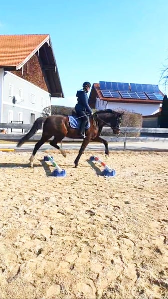 Eleganter brauner Wallach, geboren im März 2017 mit einem Stockmaß von ca. 170 cm. Sunny überzeugt durch seine hervorragende Grundgangarten und ist ein echter Hingucker im Viereck mit viel Potenzial nach Oben. Er kennt Cavalettiarbeit und kleine Sprünge. Er ist jedoch kein Anfängerpferd und wird nur in erfahrene Hände abgegeben. Zudem hat Sunny Probleme damit am Putzplatz ruhig stehen zu bleiben, was aber mit etwas Ruhe und Geduld behoben werden kann. Der Wallach steht aufgrund eines Unfalls meiner Tochter momentan nicht im Training und kann daher nicht Probegeritten werden. Er steht zurzeit im Offenstall kennt aber auch Boxenhaltung. Sunny sucht ein neues Zuhause in dem er gefordert und geschätzt wird. Bei Interesse oder Fragen stehe ich jederzeit zur Verfügung,