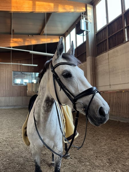 Questa femmina di 10 anni ha un carattere un po’ particolare e è un po’ testarda in maneggio, ma rimane sempre assolutamente gestibile. Ha bisogno di una persona che dia linee chiare, e in quel caso si dimostra affidabile e collaborativa. Sotto la sella ha il giusto entusiasmo, ma è sempre controllabile. Data la sua sensibilità, reagisce immediatamente alle stimolazioni di gamba e voce – quindi non adatta a principianti, ma a un cavaliere sensibile ed esperto. Si distingue per ottimi passi di base, motivo per cui è interessante anche per la dressage. In salto ha esperienza fino a 135 cm, è piazzata a livello nazionale fino a 130 cm e ha vinto a livello internazionale fino a 125 cm. Brava con il ferratura, il carico, le uscite in passeggiata, ecc. In possesso da 7 anni, sempre sana e senza infortuni. A causa di un incidente e del conseguente lungo periodo di inattività della cavallerizza, si affida solo a mani esperte! Priorità al carattere rispetto al prezzo! PK 20.000-25.000 €.