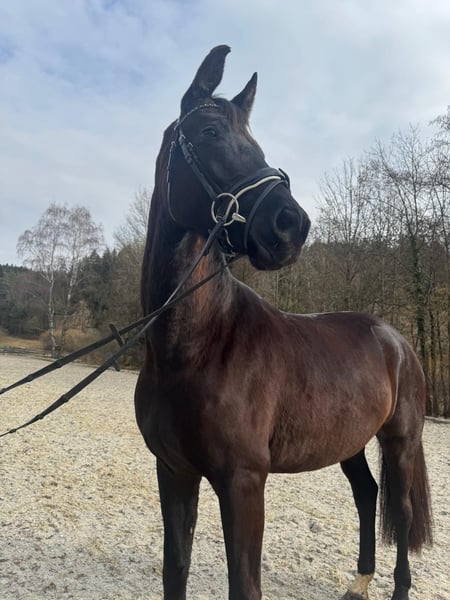 For sale is a stylish, large-framed black mare, daughter of the proven elite stallion Millennium and the state premium mare Donna Bellissima. The mare impresses with her quality, presence, and three good basic gaits. She has already proven herself successfully in dressage competitions at the A level, placing well and even winning in this class. She was gently and age-appropriately backed directly by the breeder and is currently in training, preparing for the dressage horse class L. She is also familiar with small jumps, both in the arena and in the field. Additionally, in 2025, she completed her mare performance test with an overall score of 7.68 and achieved fifth place in the four-year-old riding horse class with a score of 8.0. Excellent health condition with a current veterinary certificate. Always barefoot so far.