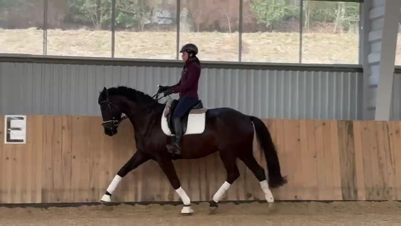 Zum Verkauf steht eine schicke, großrahmige Rappstute, Tochter des bewährten Elitehengst Millennium und der Staatsprämienstute Donna Bellissima. Die Stute überzeugt durch ihre Qualität, Ausstrahlung und ihre drei guten Grundgangarten. Diese konnte sie bereits erfolgreich unter Beweis stellen und sich in Dressurpferdeprüfungen der Klasse A platzieren und auch in dieser Klasse gewinnen. Die Stute wurde direkt beim Züchter schonend und altersgerecht angeritten und befindet sich aktuell in Beritt, wo sie für die Dressurpferde Klasse L vorbereitet wird. Sie kennt auch kleine Sprünge, am Platz und im Gelände. Ebenso hat die Stute im Jahr 2025 die Stutleistungsprüfung mit einer Gesamtwertnote von 7,68 abgelegt und hat bei der Reitpferdeprüfung für 4-jährige mit einer Wertnote von 8,0 den 5. Platz belegt. Top Gesundheitszustand mit aktuellem TÜV. Bisher immer Barhuf. Ist im Herdenverband aufgewachsen, kennt Offenstall und Boxenhaltung. Regelmäßig geimpft und entwurmt.