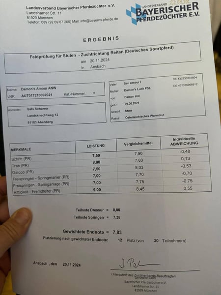 Damon's Amour to bardzo dobrze jeżdżąca, uczciwa klacz prosto od hodowcy. W 2025 roku już zdobyła DPA i zakwalifikowała się do Mistrzostw Niemiec. Przeszła próbę terenową w Bawarii z świetnymi ocenami, a podczas zimowych miesięcy opanowała lekcje L. www.s-pferde.at Dostępny jest również bardzo dobry certyfikat RTG z 2024 roku.