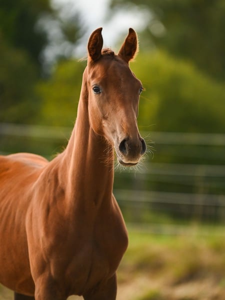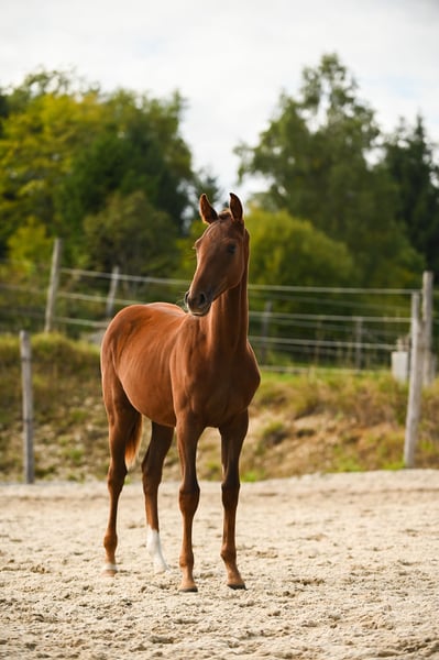 Dornröschen -Eine waschechte Waldviertlerin mit Charakter und schicker Dunkelfuchsjacke! Mit einem lachenden und einem weinenden Auge verkaufe ich meine kleine, selbstgezogene "Rosi". Rosi wird mit sehr viel Herz im großen Herdenverband gemeinsam mit 2 anderen Fohlen aufgezogen. Sie war von der ersten Minute an sehr menschenbezogen und hat schon nach ein paar Stunden alle mit ihrer Persönlichkeit überzeugt. Ihre neugierige, ausdrucksstarke und mutige Art zeugt von Charakterstärke, von der man später im Sport bestimmt profitiert. Ihr schickes und modernes Fundament verdankt sie der guten Abstammung und auch die Gänge lassen ein Nachwuchstalent im Dressursport bei guter Ausbildung nicht nur erahnen! Schon jetzt kennt sie Maschinen, Wasser, Kinder, Hunde, Kühe und alle anderen möglichen lauten Geräusche. Bei der Übergabe beherrscht sie natürlich das komplette Fohlen-ABC. Impfungen, Entwurmungen und ein regelmäßiger Kontrollblick vom Hufschmid sind selbstverständlich! Wöchentliche Spaziergänge (alleine) und auch etwas Bodenarbeit meistert sie bereits mit einer Selbstverständlichkeit. Auch bei kleinen Ausritten war sie schon Handpferd mit dabei und weiß sich stets zu benehmen. Sie versucht immer, alles richtig zu machen und gibt permanent ihr Bestes, um einem zu gefallen. Zusammengefasst: Rosi hat einen *top Charakter* und ein hervorragendes Gangbild, sodass sie ihrem zukünftigen Besitzer bestimmt so ans Herz wächst wie uns. Ihr könnt uns gerne jederzeit nach Absprache besuchen. Wir freuen uns darauf, Rosi in liebevolle und erfahrene Hände abzugeben! Platz vor Preis! sollte sich ein TOP Zu Hause für unsere Rosi finden ist der Preis verhandelbar!