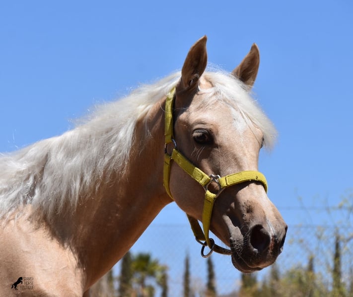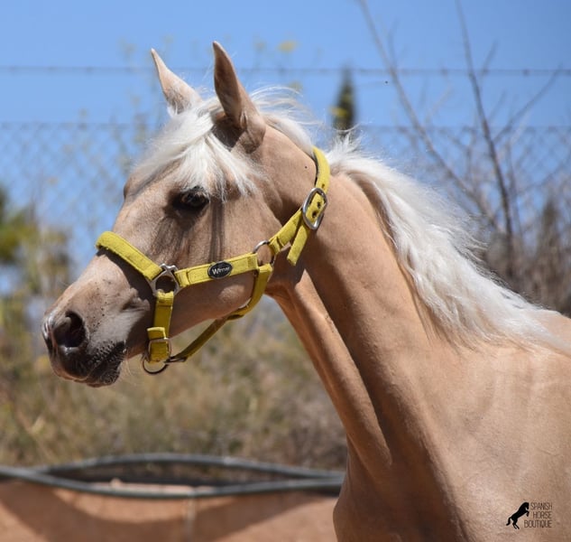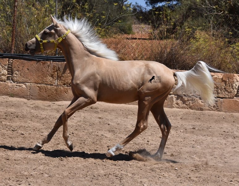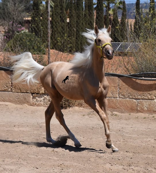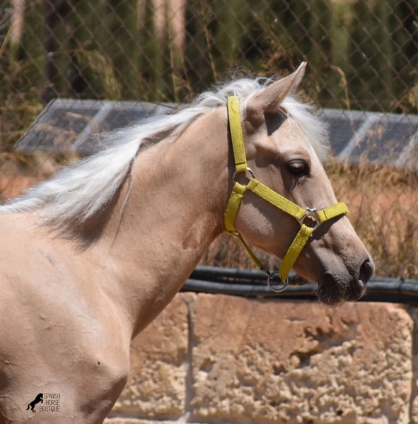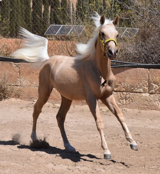 This golden treasure is very special on many levels. As an Azteca (or Aztec) he is a rarity in himself, because this wonderful breed, in his case by a Quarter dam and P.R.E. dad, does not come along very often. And then in the special color palomino, with a wonderful shimmer, what a jewel! But that's not the end of the special features, because this little rascal is already so light-footed and agile that he puts many big ones in the shade. The icing on the cake is that he is also an absolute cuddler! The breeder's daughter's favorite from birth, he's the spoiled darling, but you can't blame him for that - with his cute googly eyes, he simply wraps you around his finger straight away. When he then sweeps uphill, downhill and across the course, his already full mane in the wind, with his best movement, he definitely takes your breath away. The two white socks probably give his hind legs an extra boost, because he has very strong and agile hindquarters. On top of that, he is courageous and self-confident, typical of the breed, which will later make him predestined for working equitation, baroque riding, western and of course other disciplines. His expected final height is around 158cm and he is already chipped, so he will soon be ready to travel to your home to make your heart beat faster. He is currently in Mallorca! Videos and pedigree on request. I would be happy to organize an AKU, transport or even your trip if you come to see him in person. Details can be found on my website or in conversation. Saludos from Spain