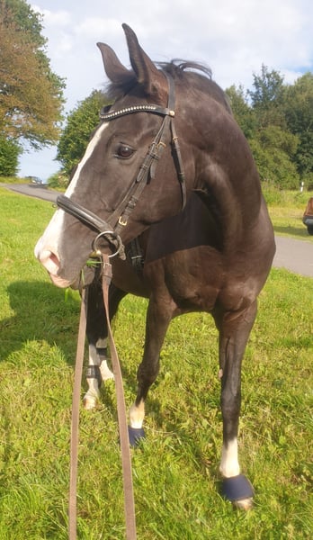 Carl-Fredo, affectionately called "Calli," is a beautiful 16.1 hh black gelding of Württemberger origin. Born on June 26, 2010. Calli is a dream to ride, responds very delicately to aids, and moves forward willingly. He used to compete in show jumping and dressage, but is now exclusively used for leisure riding and is intended to be sold as a pure recreational horse. He is very sensitive in the mouth and along his back, so he is not suitable for beginners or heavy riders. I enjoy taking him out on rides, both alone and in groups, and he is the perfect reflection of his rider during these outings. If the rider is confident and relaxed, Calli is the same. He needs a loving yet consistent handler who can build a trusting relationship with him. He is seen by the veterinarian annually, receives all vaccinations, is treated chiropractically, and is regularly shod. Shoes remain very important for him! At night, he is kept in a spacious outdoor box, and during the day, he is turned out on pasture. He is herd-friendly, but despite his impressive appearance, he tends to be lower in the pecking order and appreciates having his own retreat and cozy box for the night. Daily turnout from morning to evening is an absolute must, and in summer, he is happy to be turned out full-time. He can be loaded with a bit of persuasion. Calli is a sensitive and people-oriented horse. It is absolutely essential for me to find him a caring, consistent owner who values proper horse care and has no ambitions for competition, someone who will take the time to understand and bond with him. My dream is a private stable with a small herd. A loving home is my top priority. If you are looking for a loyal leisure partner and family member, and do not see your horse as a mere sport tool, I would be happy to discuss further details during a personal meeting.